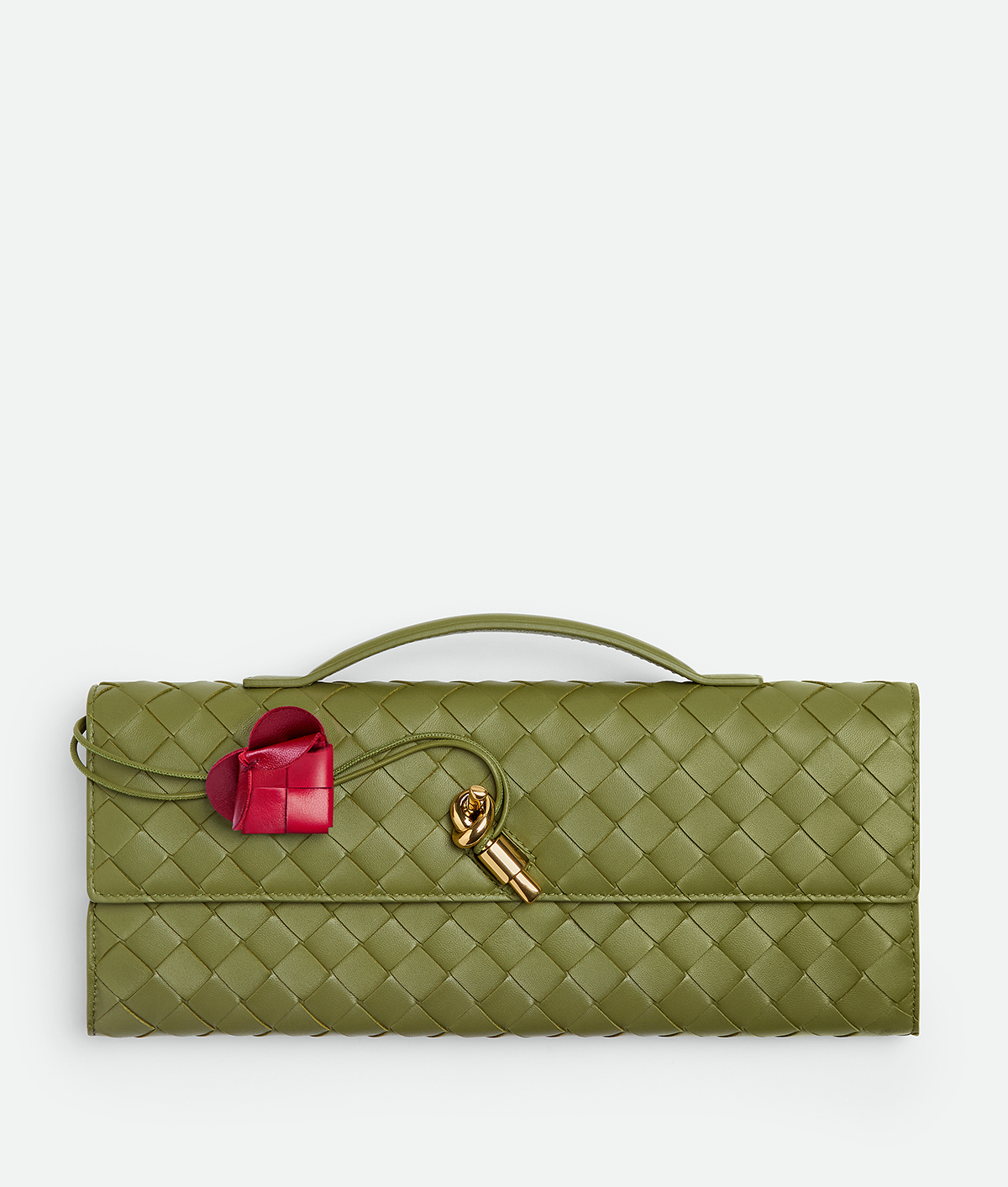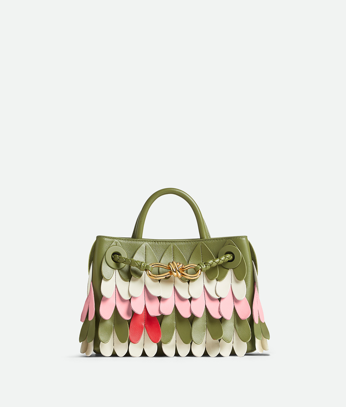 ミニ アンディアーモには、帯状のレザーハートモチーフをグラフィカルに配置。型抜き専用工具を用いて精緻にカットされたハート型パーツが、バッグ全体に幾何学的でリズミカルな表情を与える。一方、ハートトートは、イントレチャートで編み上げたパネルをベースに、配置決めから縁取り刺繍、最終仕上げに至るまで、熟練職人の手仕事によって完成される。