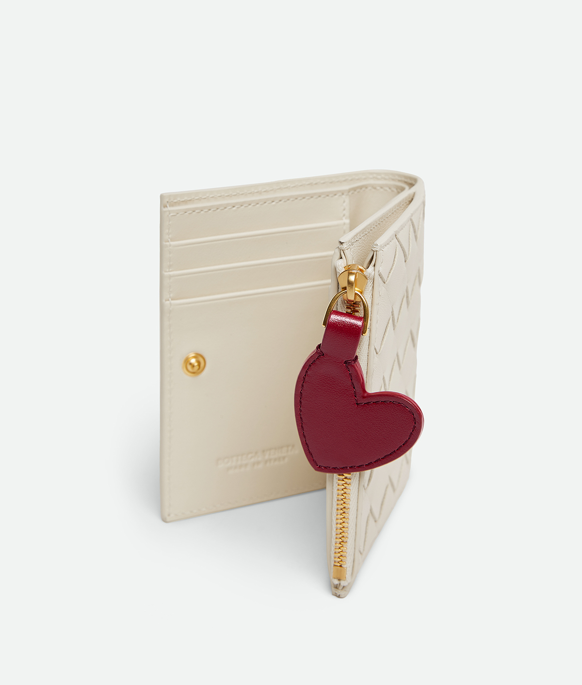 また、スモールレザーグッズでは、ハートモチーフをチャームやジッププラーとして取り入れ、バッグと共通のデザインで統一感を演出。イントレチャートで制作されたハート型チャームには、コントラストカラーのリップスティックレッドを効かせ、さりげないアクセントを添えている。取り外し可能な仕様で、スタイリングに合わせたアレンジも楽しめる。