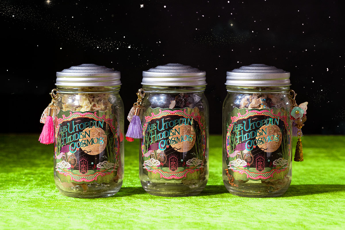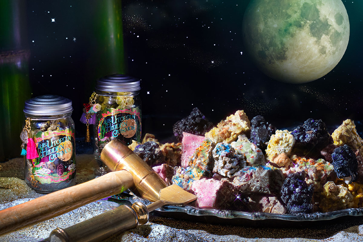 竹取物語に着想を得たチョコレート銀河から採取できるのは、5種の「天体のかけら」。来場者は好みの天体を2種選び、その場で掘削されたチョコレートを瓶詰めで受け取ることができる。味わいはもちろん、かけらそれぞれの物語性やビジュアルまで含めて楽しめるのも小楽園ならでは。