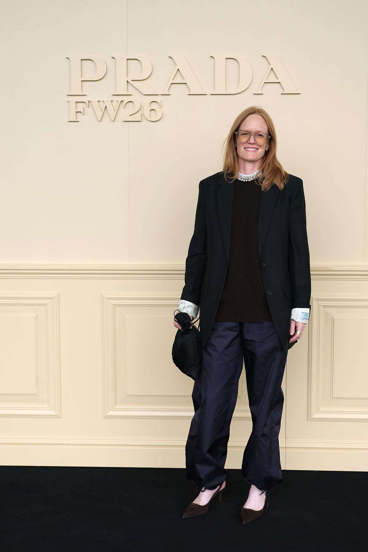 また、よく目を凝らすと、シャツ地のインナーは単純にカフスを幅広に折り曲げているのではなく、ルックによっては片側をカラフルなカフリンクスで留め、もう片側はあえて大胆に折り返すなど微妙な表情を付けている。また、袖口には汚れたシミのような加工まで施されている。さかのぼれば「ミュウミュウ」2025年春夏コレクションでも、シャツの襟を片側だけわざと乱すことで幼少期のおしゃまでどこか歪な装いを表現していたが、不完全なものや未熟なものに「美」を見出すことは、ミウッチャにとって創作における重要なエレメントなのだろう。