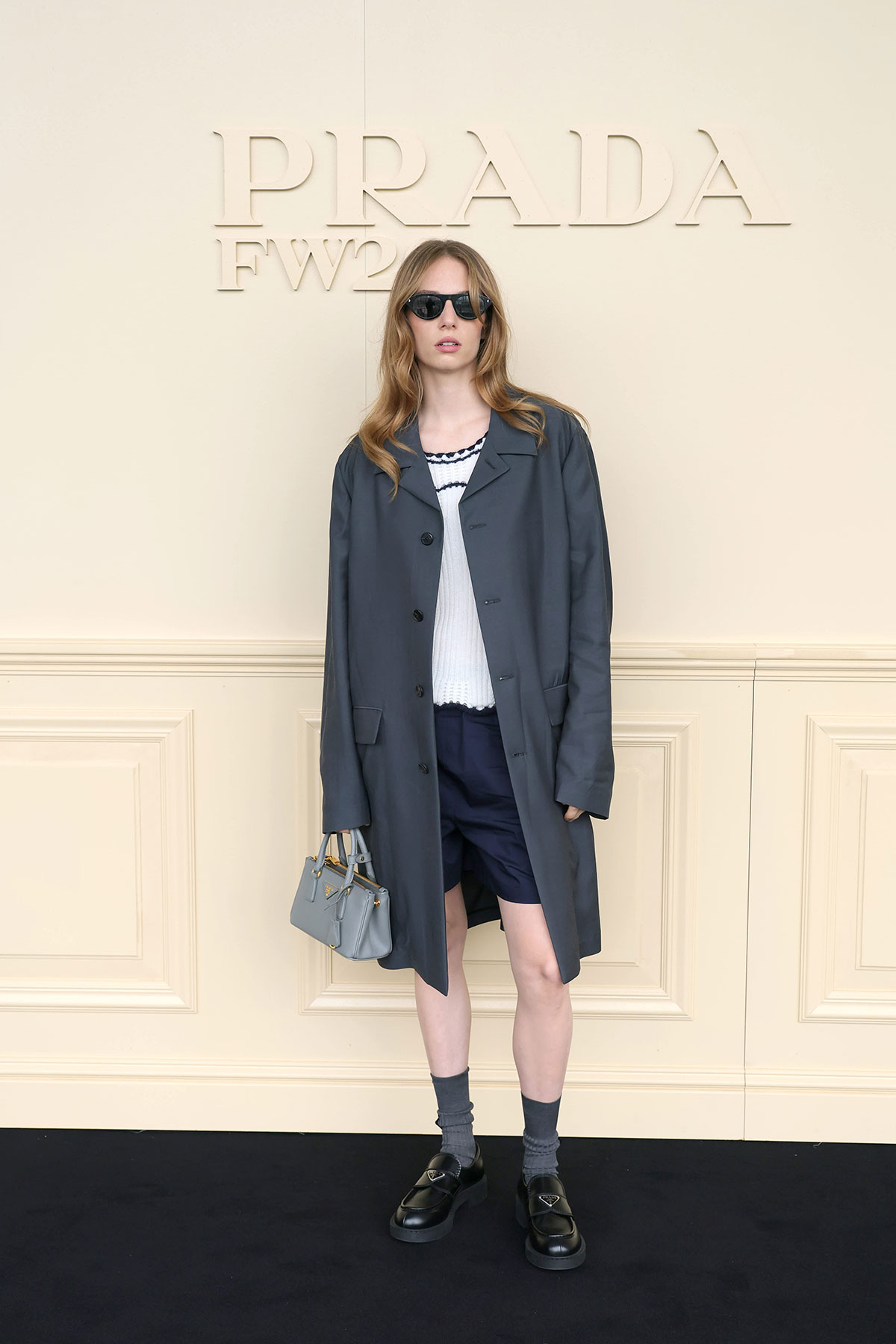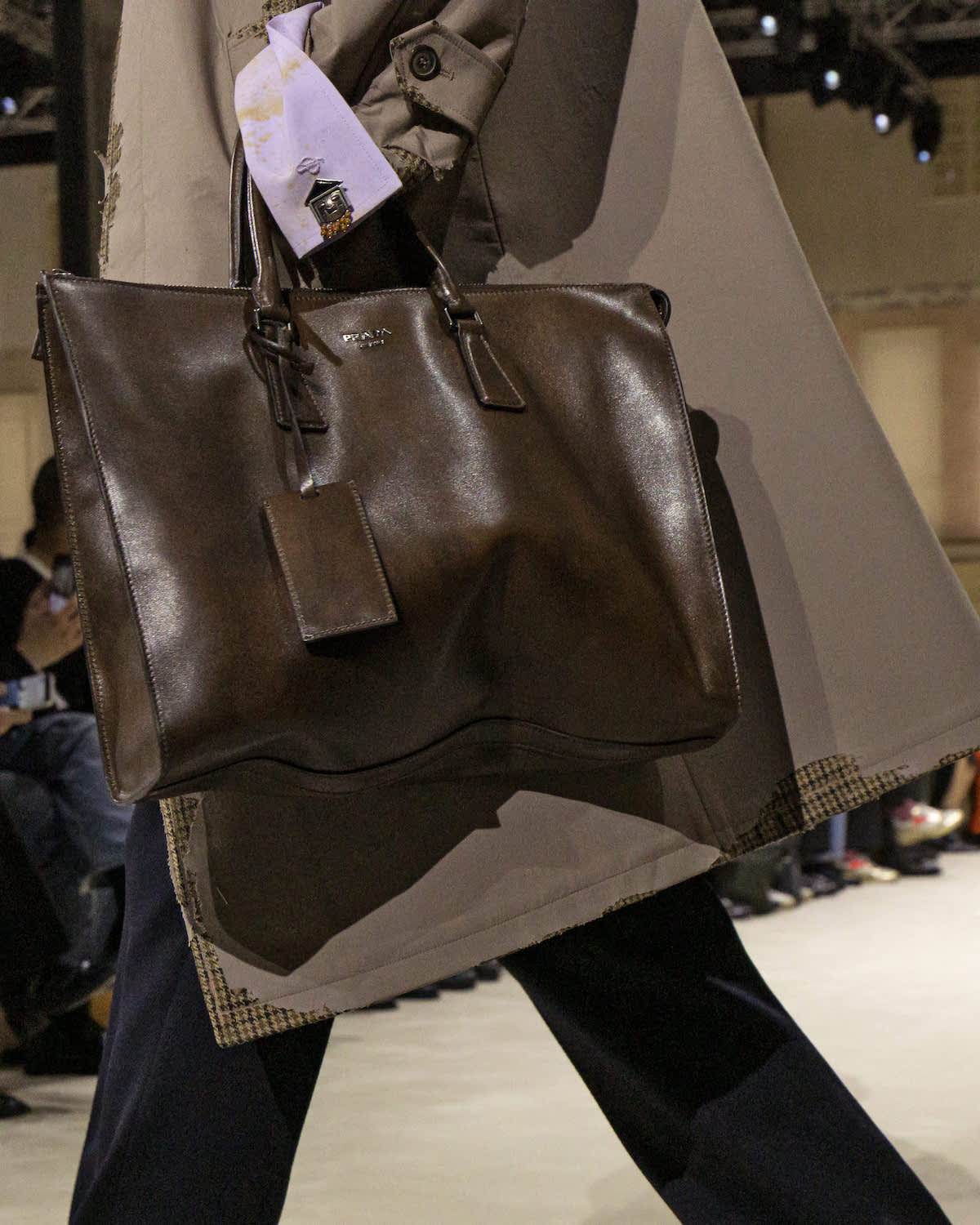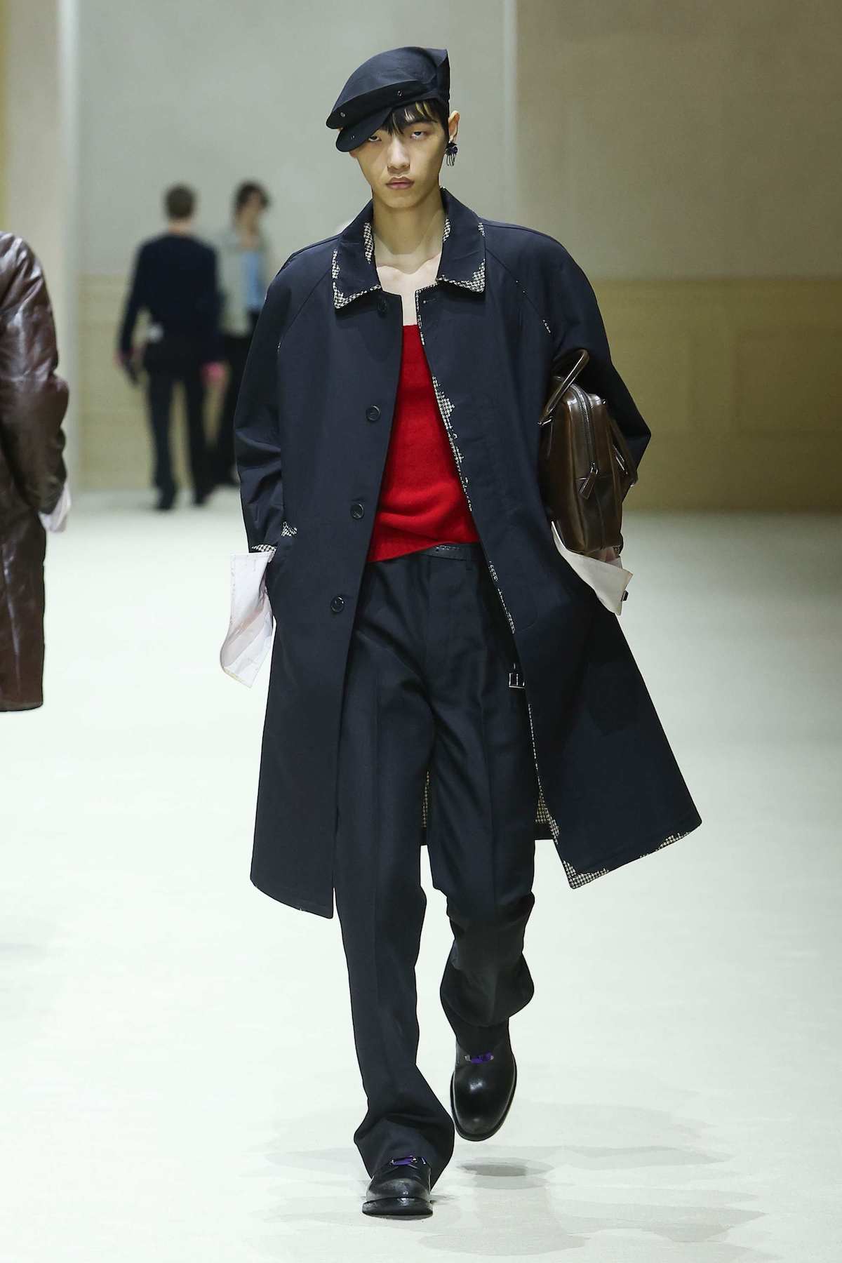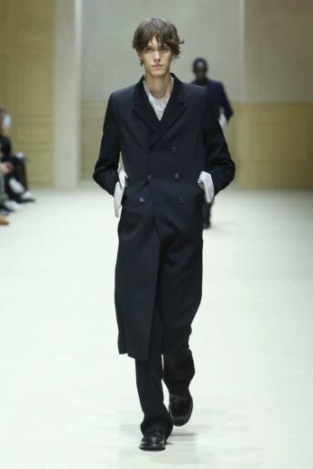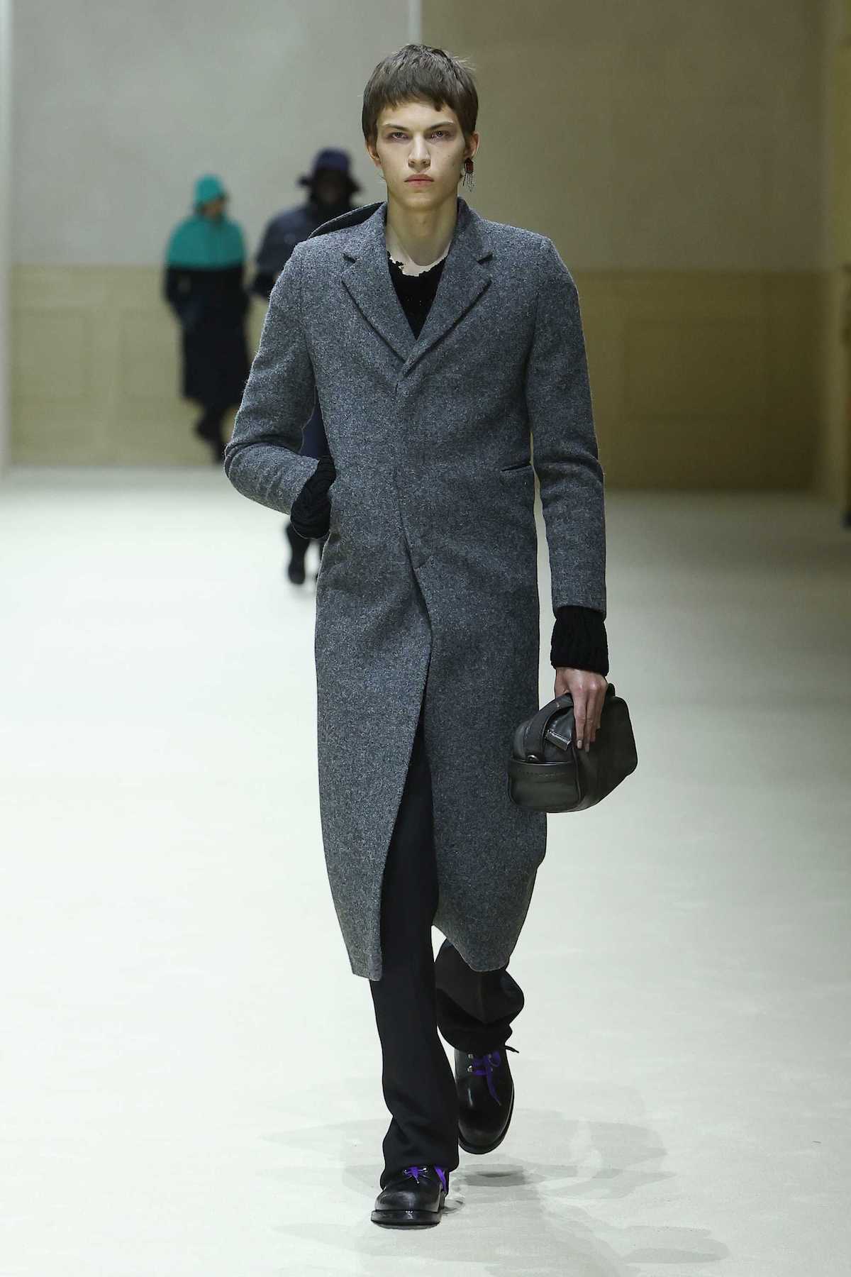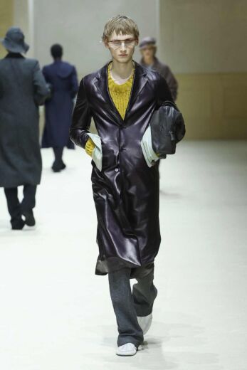 本コレクションのテーマは「BEFORE AND NEXT」。コレクションノートの言葉を借りれば、ミウッチャ・プラダとラフ・シモンズは今回、過去を消し去ることなく進化すること、そして過去から受け継いだものを活かす新しい考え方を提案したのだという。会場の四方を囲む壁面をアールデコ調のドアや窓で装飾したシンプルな空間に、アイルランドのポストパンクバンド、ヴァージン・プルーンズの楽曲『Theme for Thopught』の歪んだギターサウンドが響き渡るとショーはスタート。ファーストルックはブラックのチェスターコートとスラックス、足元にはレザーのプレーントゥを合わせた端正なスタイル。ややナローなラペルと狭いVゾーンに合わせるようにシルエットはかなり細身で、袖口からインナーウエアのカフスが無造作に飛び出している。その後も起毛感のあるウールやヘリンボーン柄だったり、シングルブレスト仕立てになったりと多少の変化はあるものの同じようなコートがメインのルックが続く。コレクションノートによると、「縦長のかっちりとした新しいシルエットは、着る人への姿勢や心構えを考慮したものであり、不安定で予測不能な時代において、こうした明快さが安心をもたらすのだ」と説いている。