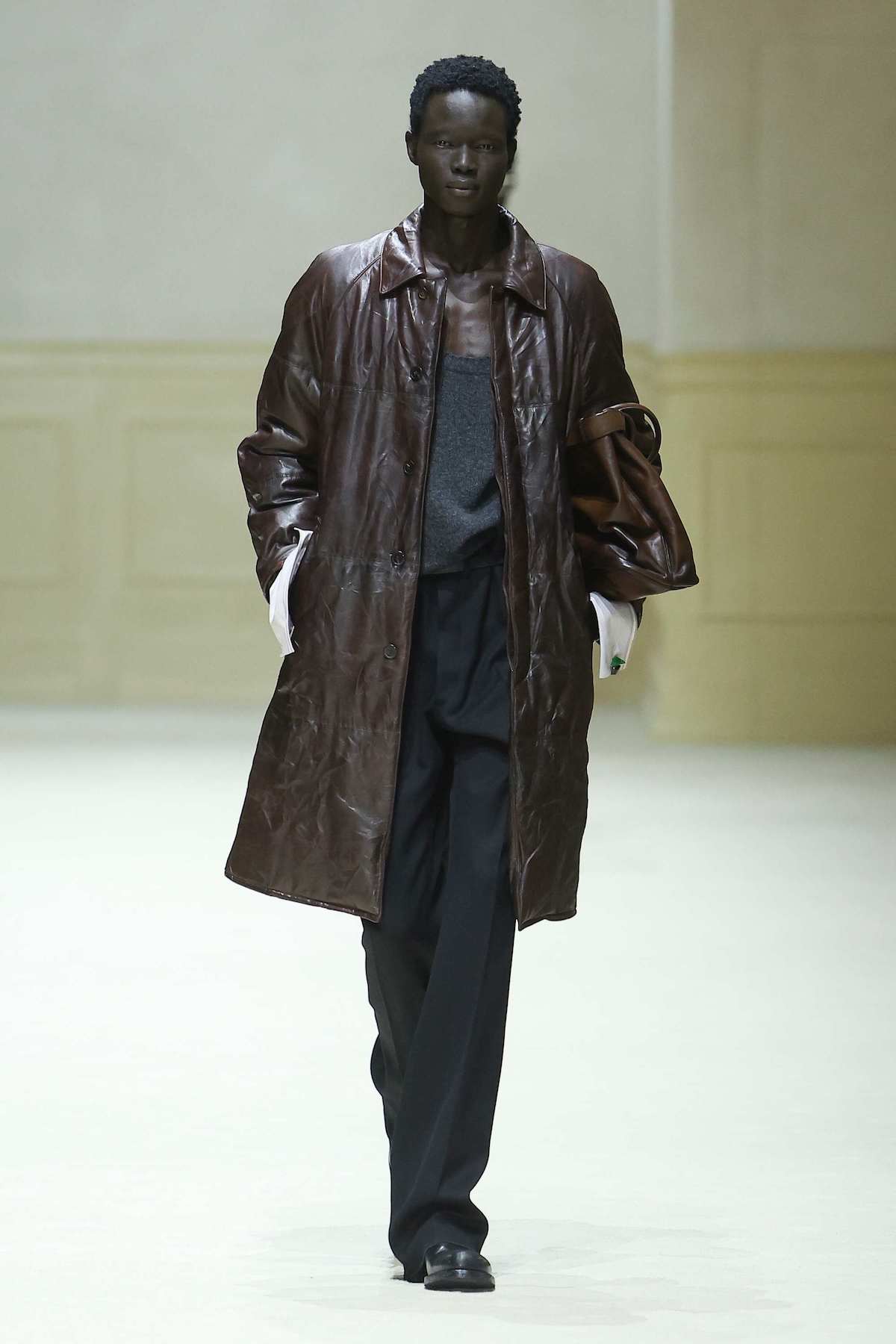 再度、コレクションノートを引用すると、時間が持つ重要性も伝統を尊ぶキーワードとしてテーマを補強していた。ショート丈とロング丈で登場した中綿入りのレザージャケットはところどころ褪色し、雑に保管されていたような無数の畳みシワが付けられている。また、先述したスクエアネックのタンクトップには布帛のタイプもあったが、日に焼けたような黄ばみや食品汚れを思わせるシミが施されている。いわゆる経年変化やエイジングによる美しさではなく、個々人の記憶に紐づいたような人生の痕跡が意図的に表現されており、「文化や意味、知性、配慮といった文明が育んできた普遍的な人間の価値を維持することの大切さ」を暮らしの名残りに宿す。