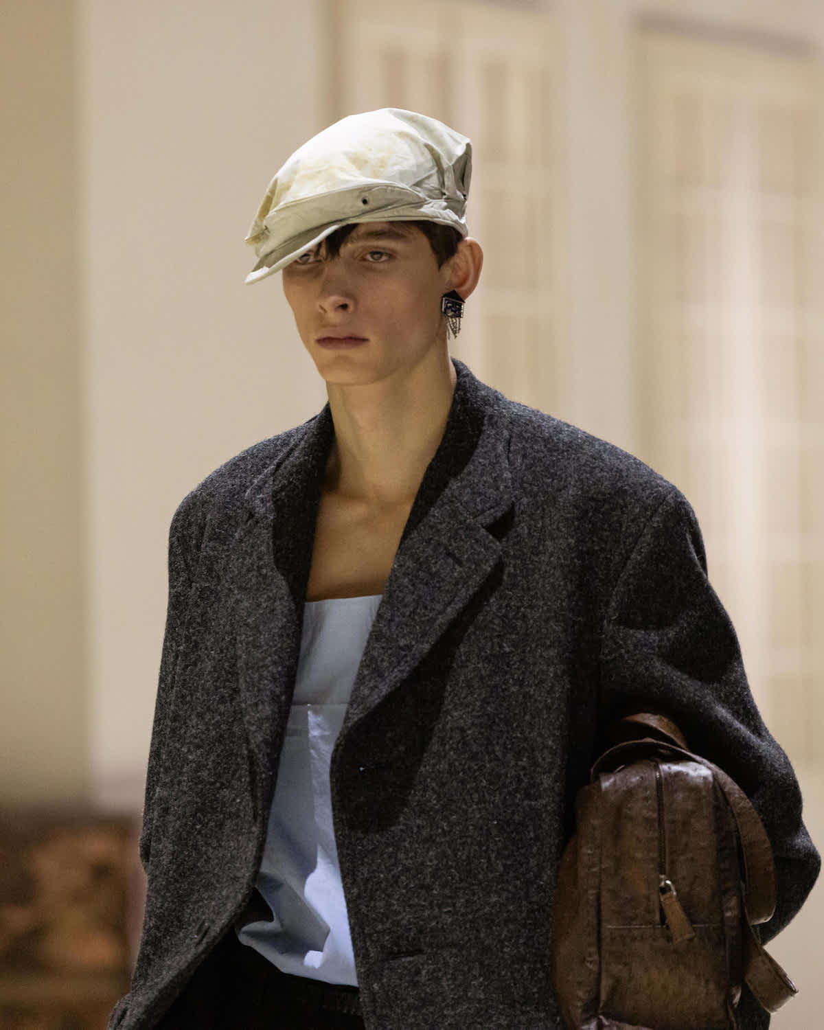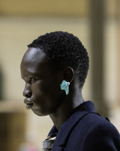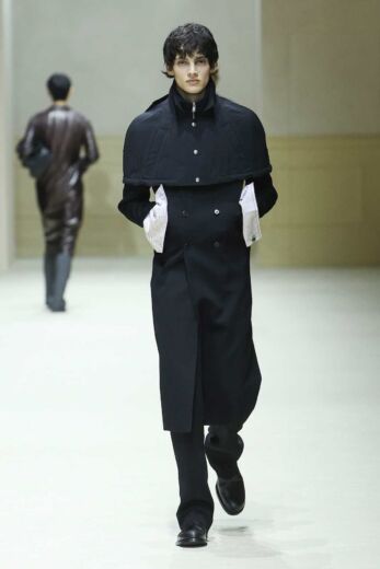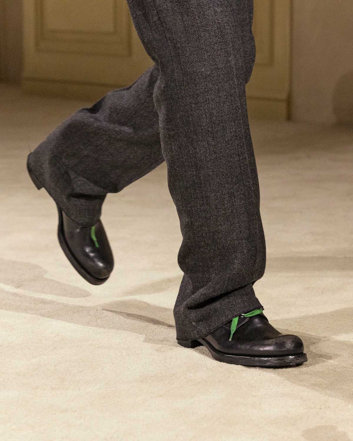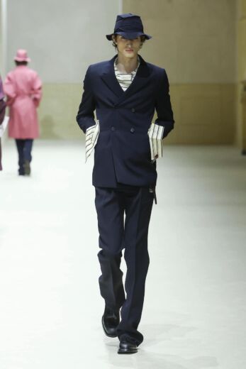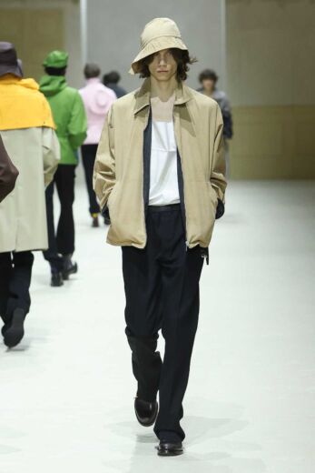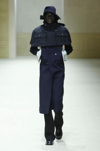 他にも小物類では、船乗りが甲板で被るサウウェスターハットが目を引いた。ランダムにプリーツを入れてシワのようなクセが付けられており、そのまま被る以外にもぎゅっと圧縮してアウターの背面に貼りつけてコサージュのようなアクセサリーとしても機能していた。また、今回カラーパレットがネイビーやグレー、ブラックなどダークトーン中心だったこともあり、レザーシューズのシューレースに取り入れられていた鮮やかなパステルカラーがモダニティを添えていたのも印象的であった。