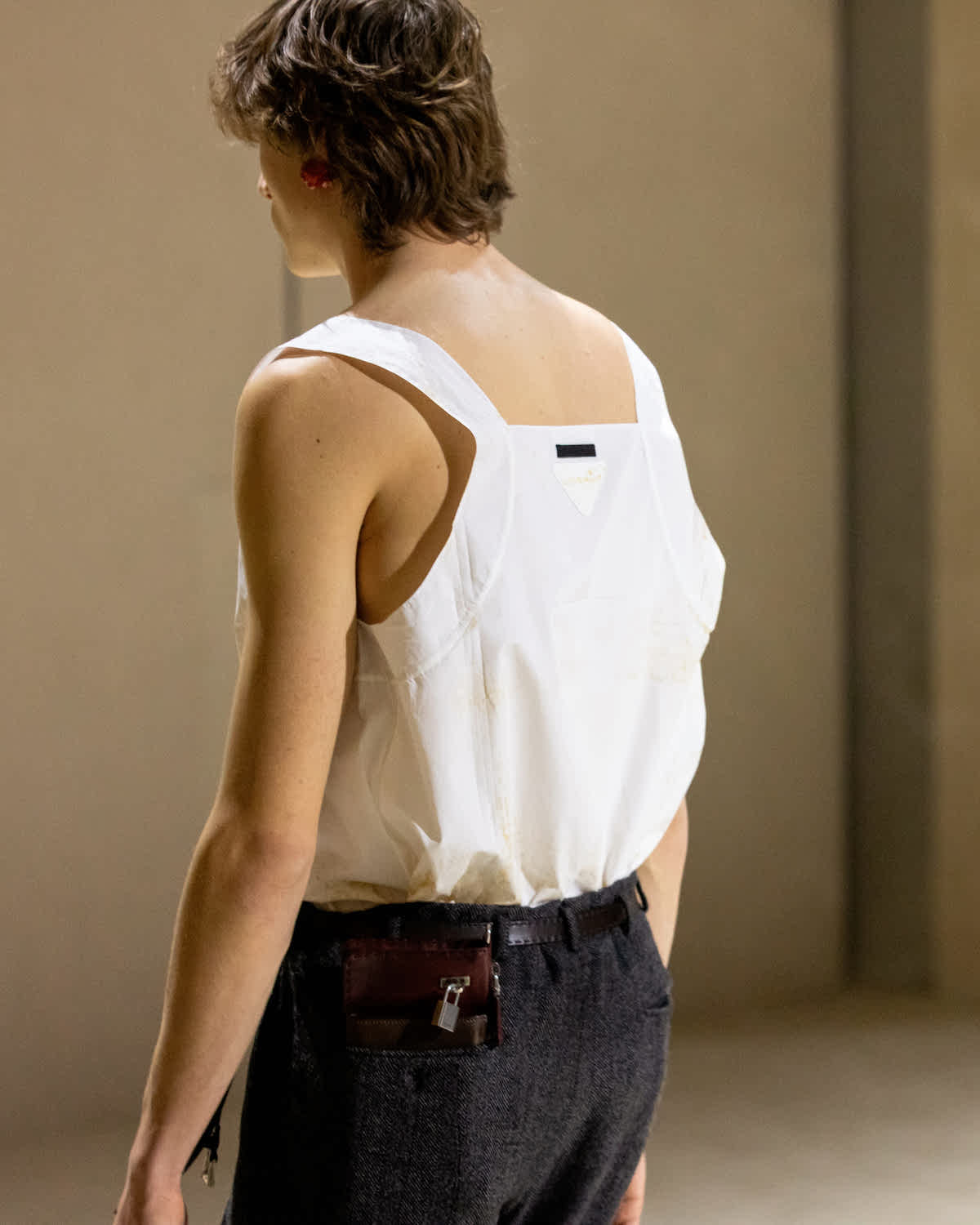 また、ジェンダーにおける旧弊な価値観にとらわれない提案も近年のプラダの特徴だ。“女性らしさ”を問い直した2025-26秋冬ウィメンズコレクションやマイクロミニ丈のブルマを取り入れた2026春夏メンズコレクションなど、画一的な性規範に対する懐疑的な視点は今回も健在だ。中盤以降に登場した素肌に着たニットのタンクトップもそのひとつ。スクエアにカットした深めの胸元や幅広のリブストラップ、ゆったりとしたシルエットなど、“マチズモ”的な肉体美を誇示するかのようなタンクトップ姿とは趣の異なるセンシュアルなムードは、コレクションのなかでも一際新鮮に映っていた。