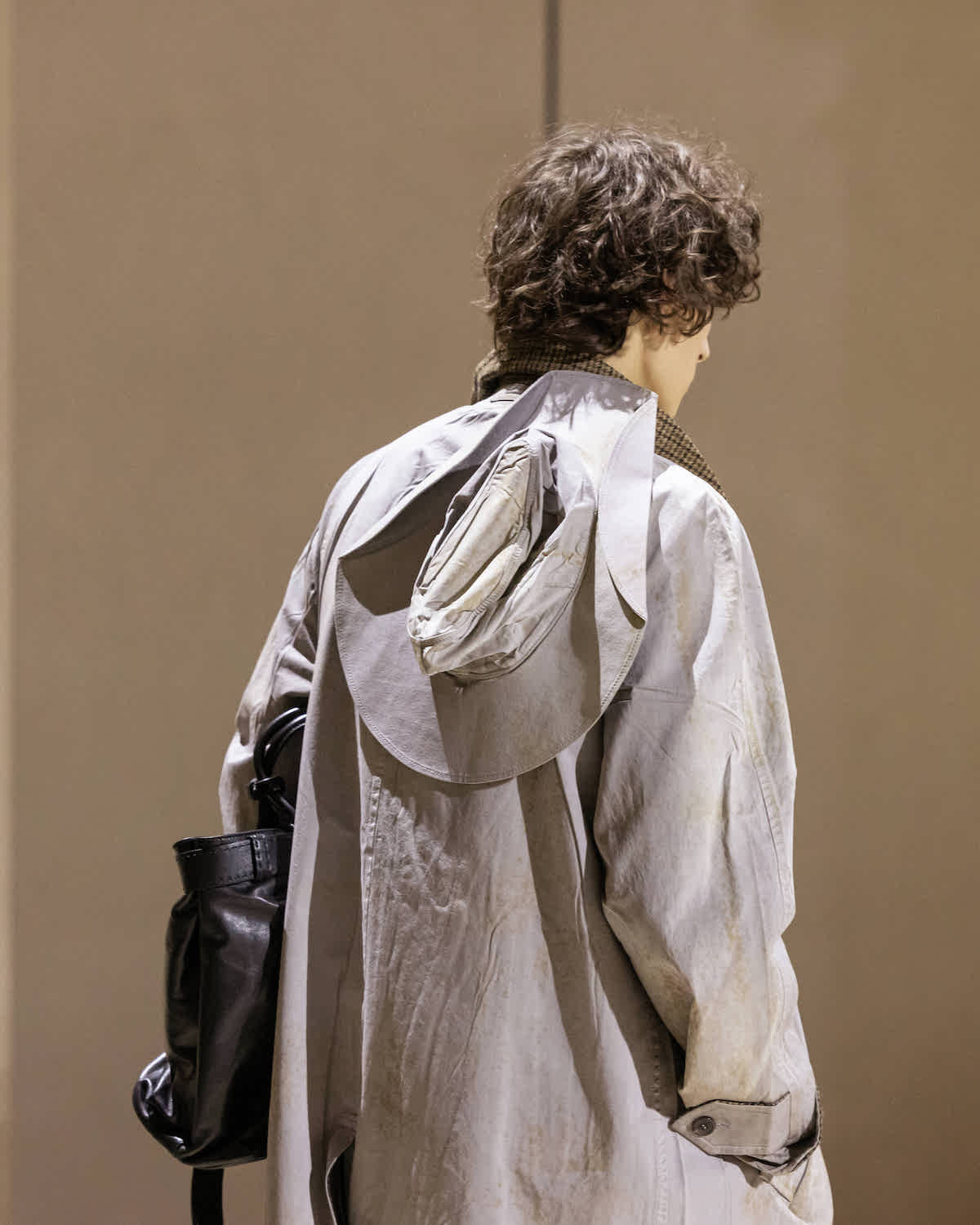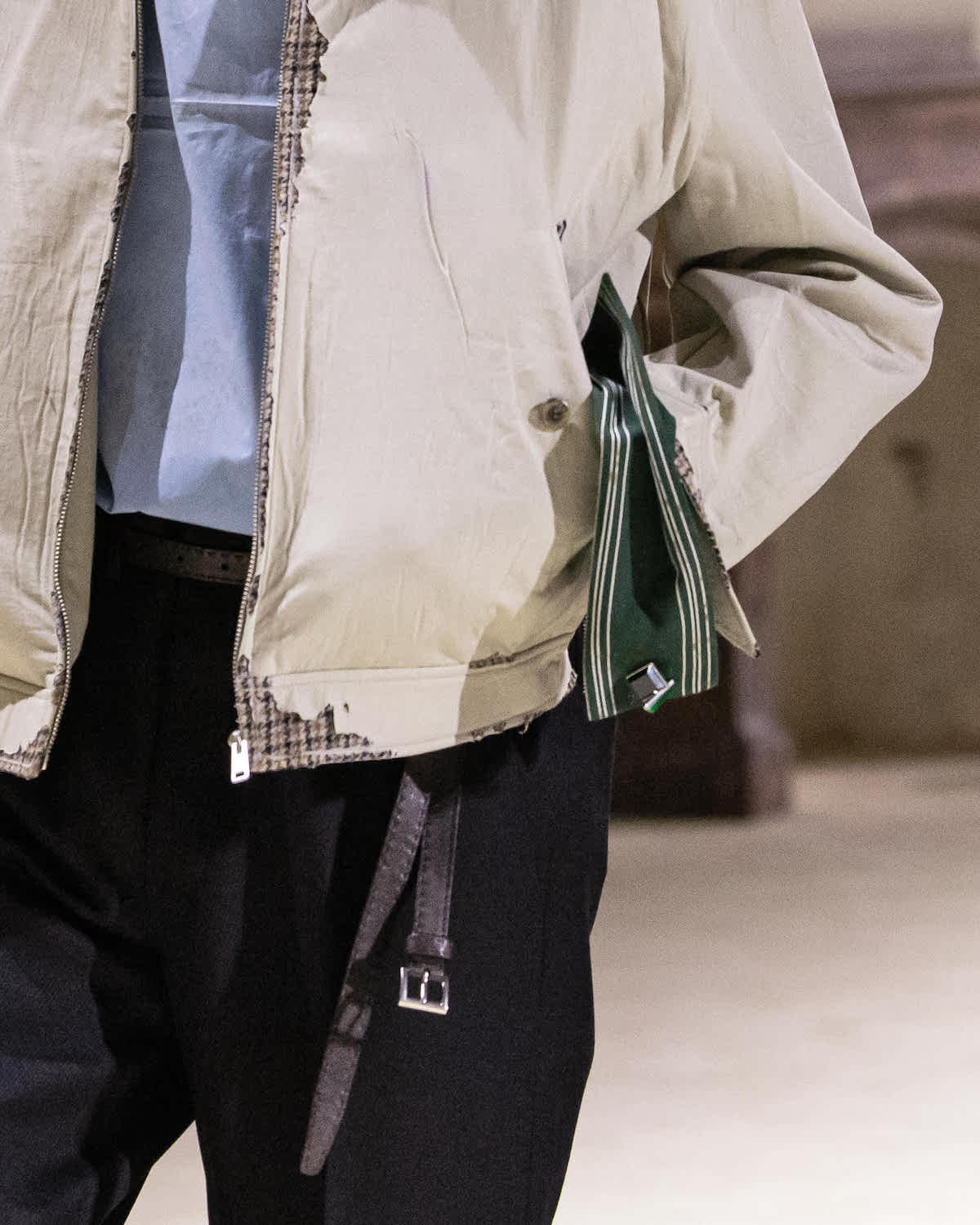 ラフ自身もコレクション終了後「考古学っぽい考えでアプローチした」と語っているように、歴史の堆積や時間の経過を表現したディテールは多方に散見された。終盤に登場したベージュのバルマカーンコートとスイングトップもその一例だ。襟元や前立て、後ろ身頃など、表地が剥がれ落ちて芯地の千鳥格子柄が露出したような手の込んだ加工が施されている。まるで土に埋もれた数千年前の遺物を、丁寧に刷毛でかき出して見つけたような多層的な意匠はまさしく「考古学」的であり、着る人のパーソナリティをじっくりと紐解くようでもある。