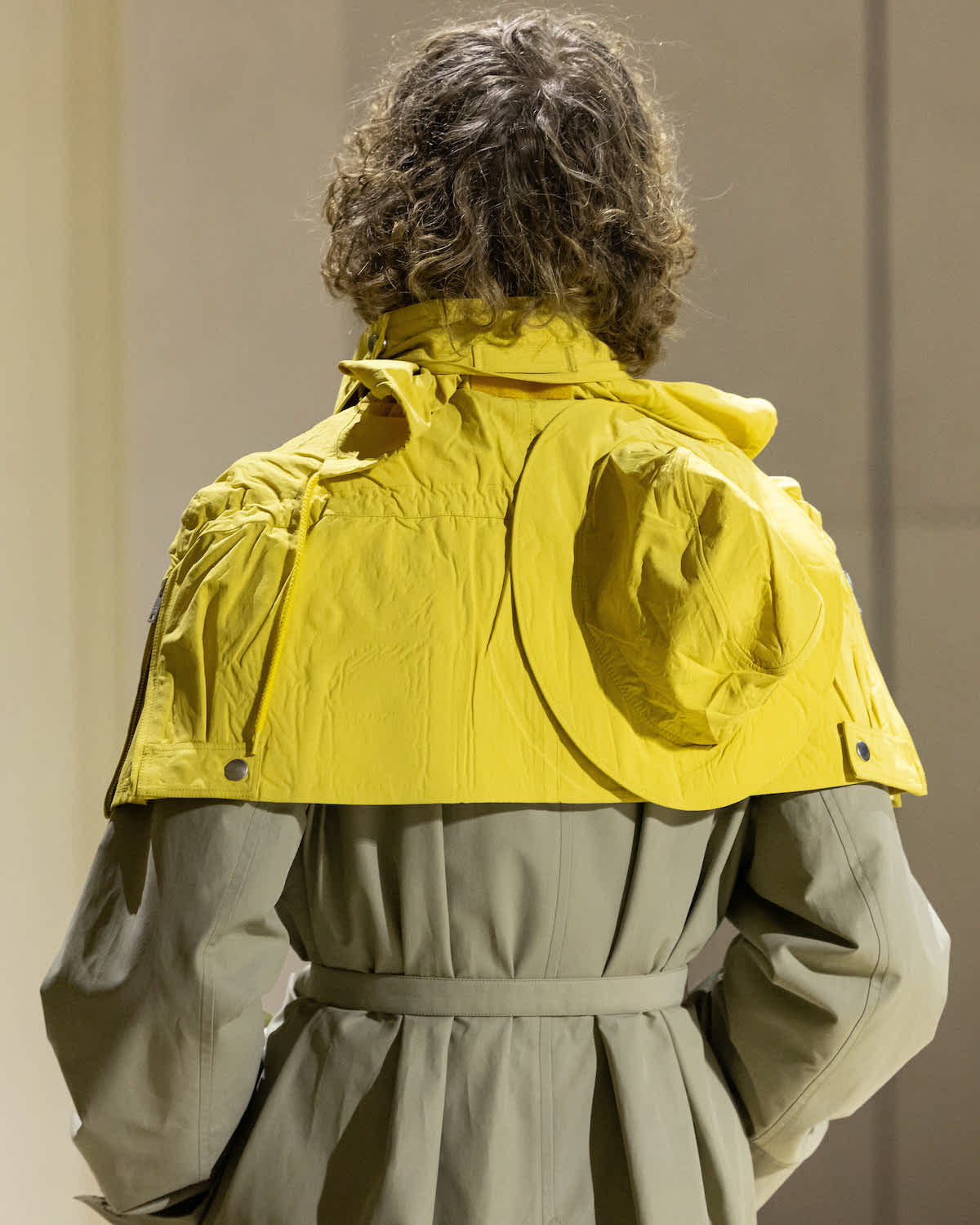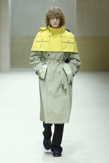 今期のテーマ「BEFORE AND NEXT」を日本的に解釈すれば、“温故知新”というニュアンスが近い。例えば、コレクションの前半にバリエーションで魅せていたトレンチコートとショートクロークの組み合わせもその好例だ。ギャバジン製の正統派トレンチコートの上部に、カットしたアウトドアライクなアウターを被せたドッキングデザイン。ネイビー地にはパステルグリーン、ベージュにはパープルというようにコントラストカラーを組み合わせ、上品なギャバジンと60/40クロスのようなヘビーデューティなマテリアルの対比が面白い。コレクションノートにも「伝統を踏まえながら、親しみのある要素を再構築し、既成概念への問いかけを通して一つのピースを組み立てた」とあるが、その言葉を象徴する一枚であった。