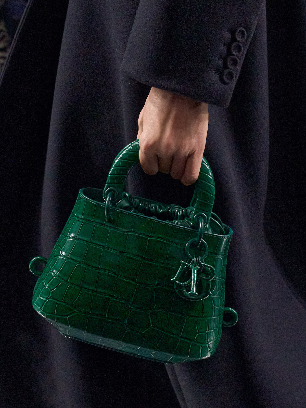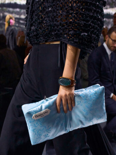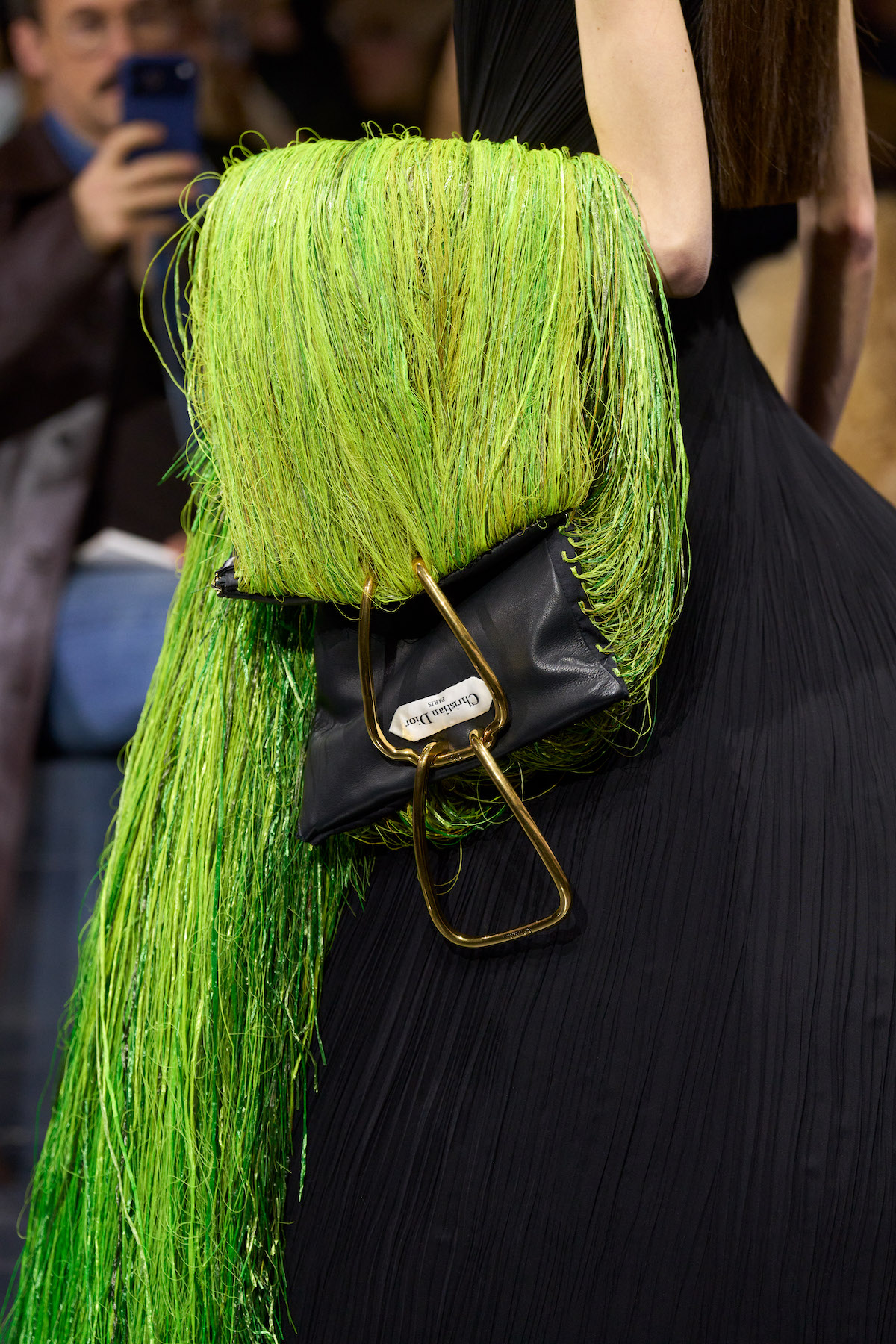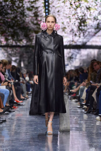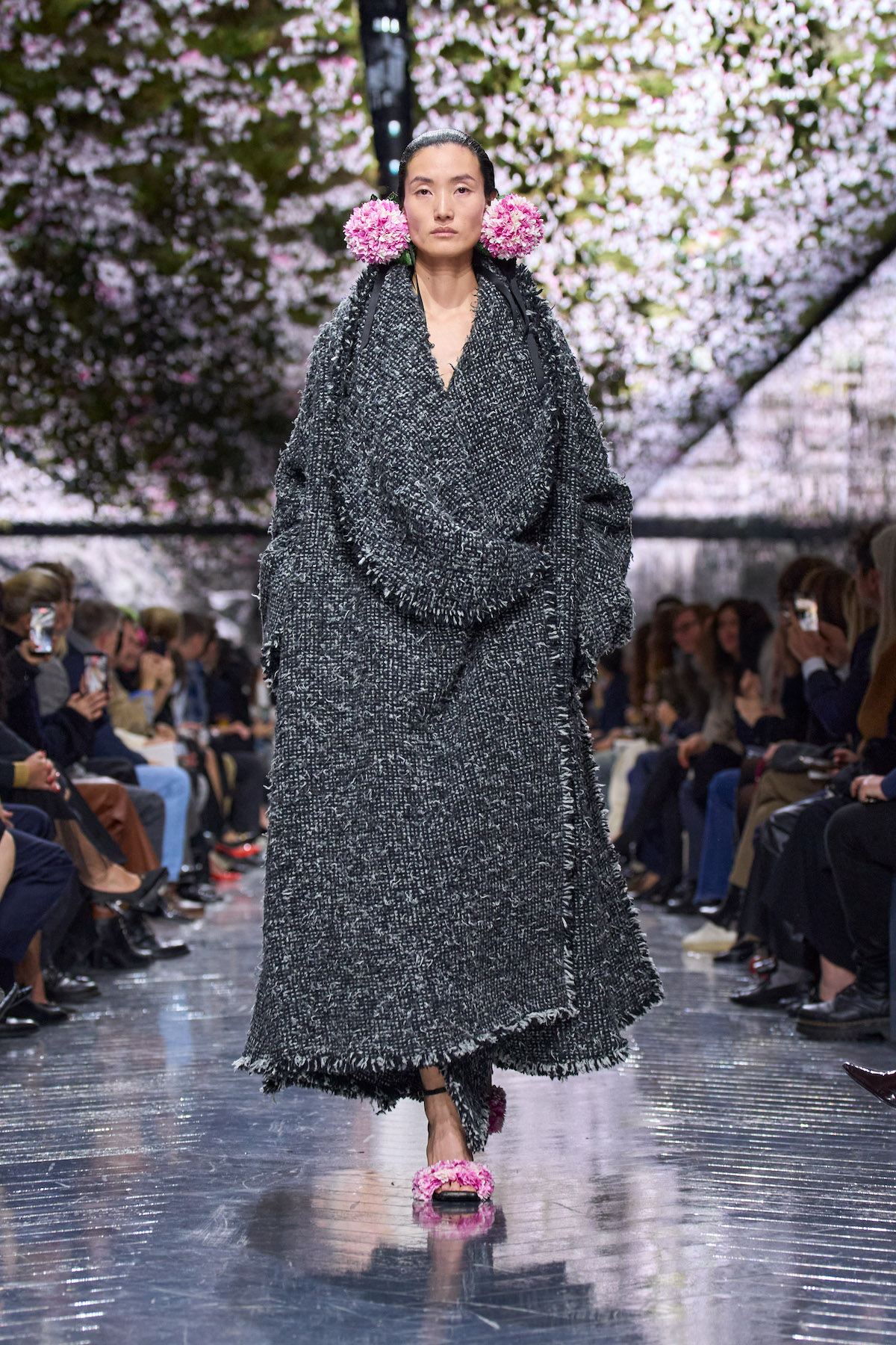 また、アンダーソンによって、これまでカーゴパンツやデニムに刷新された1948年春夏のドレス「カプリス」のシルエットは、今回もニットワンピースのフロントやツイードコートのバックスタイルに転用。「ドレスアップとカジュアルダウンという相反するものの駆け引き」は、アンダーソンの真骨頂であり、ネップのニュアンスや切りっぱなしの処理など、どこか粗野なムードを醸すコートに上質なエレガンスを付与していた。かたや、メゾンが誇るシグネチャーのひとつで、前任のマリア・グラツィア・キウリが好んで多用していたリボンやボウ(蝶々結び)のモチーフは、今回花を模したイヤーカフが目立った程度。ただ、裏を返せば潤沢なアーカイブも含めて、先人たちのレガシーが余りあることの証左とも言えるだろう。