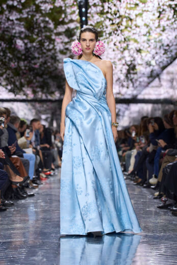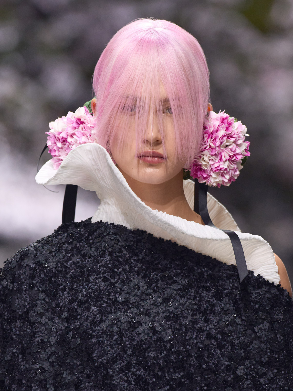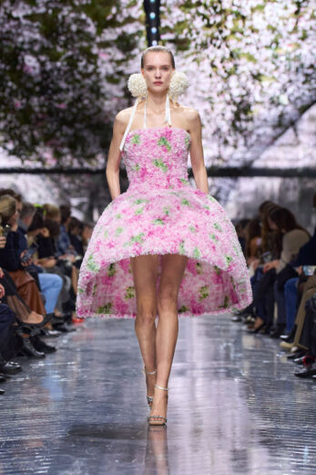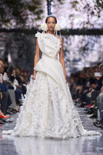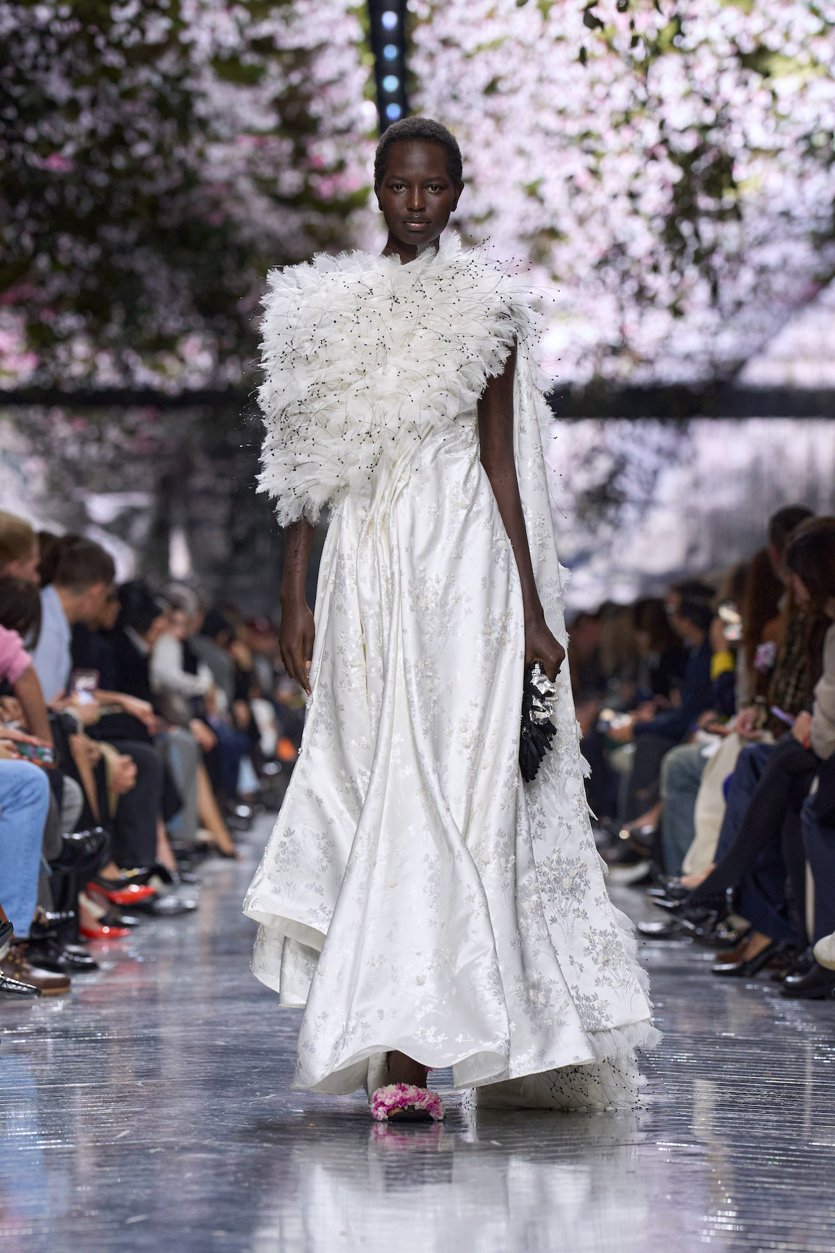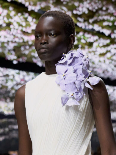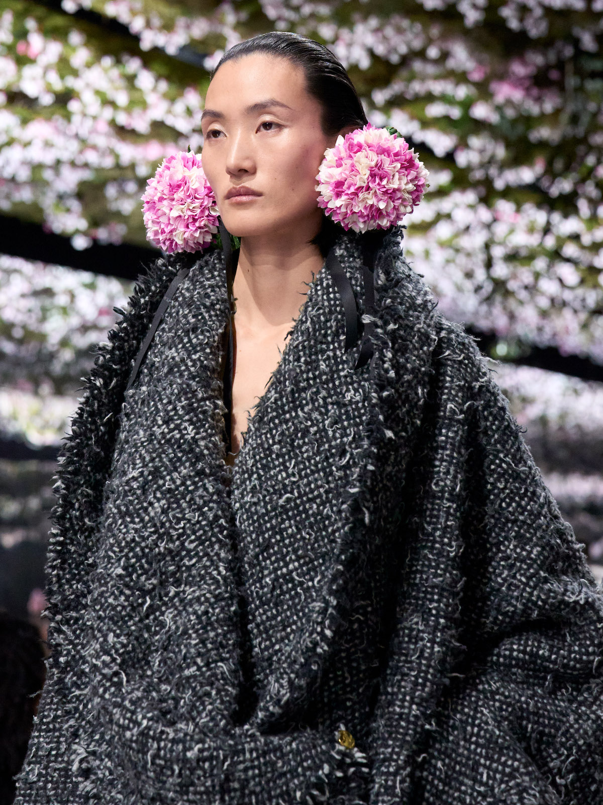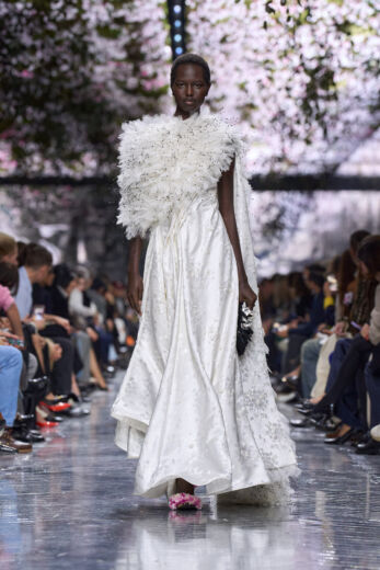 会場となるロダン美術館の天井には、“藤の花棚”を彷彿とさせるようなシクラメンの生花でびっしりと覆い尽くされている。これは、数ヶ月前にアトリエを訪れたジョン・ガリアーノがジョナサンに手渡したシクラメンの花束に感銘を受けたことが本コレクションの起点となっている。2011年に思わぬ形でディオールを追われた憧れのガリアーノから託された詩的なバトンは、オートクチュールという古典芸術を守り抜くというアンダーソンの気持ちを後押ししたことは間違いないだろう。