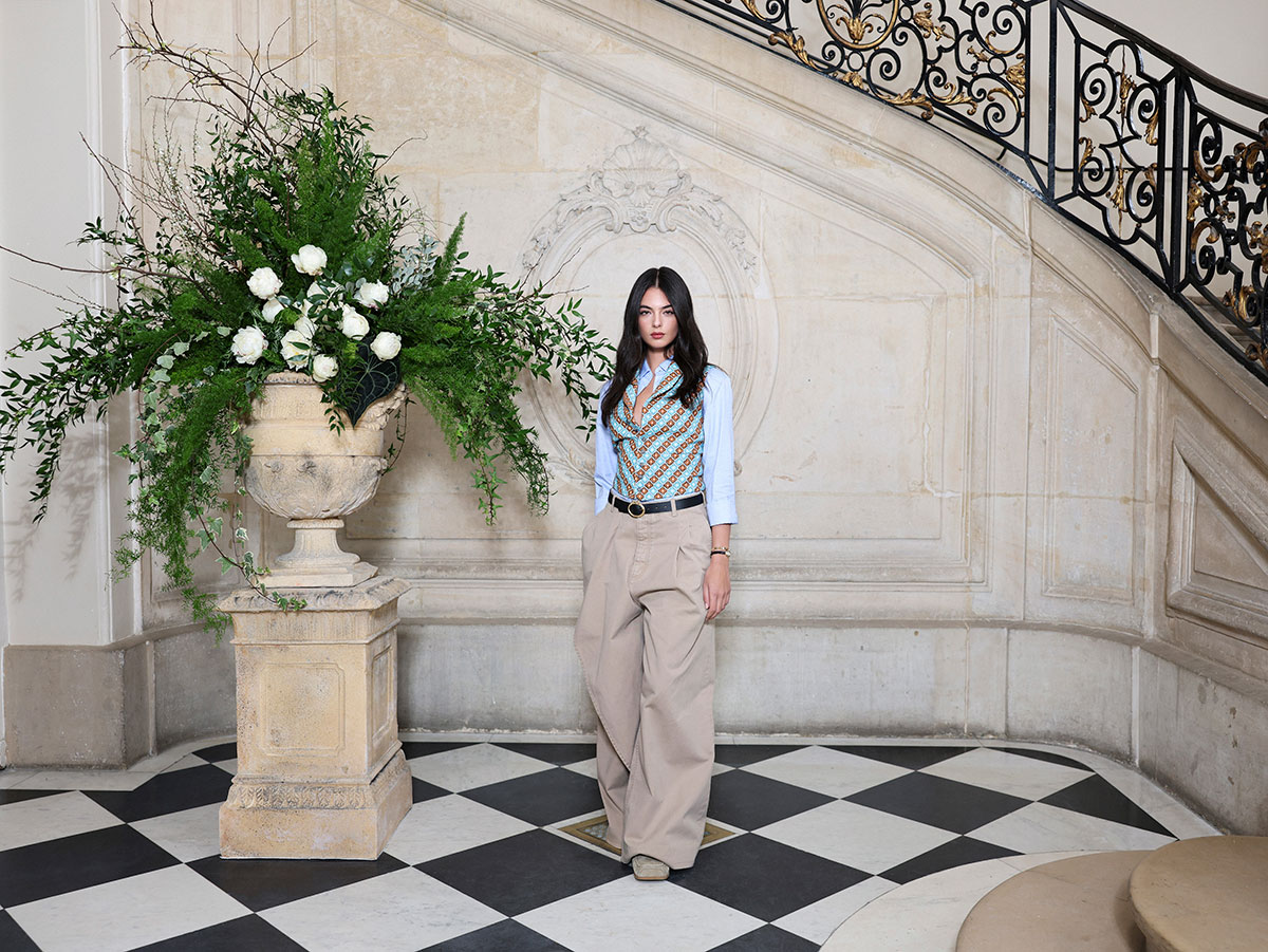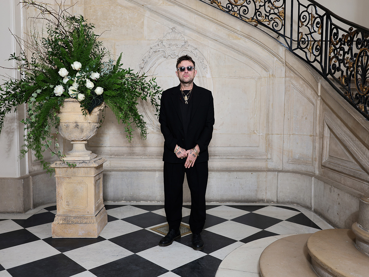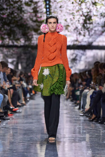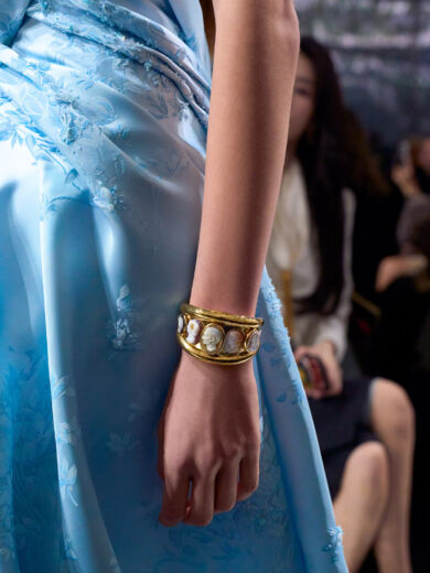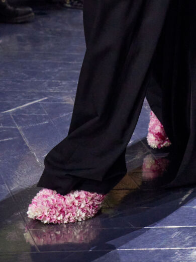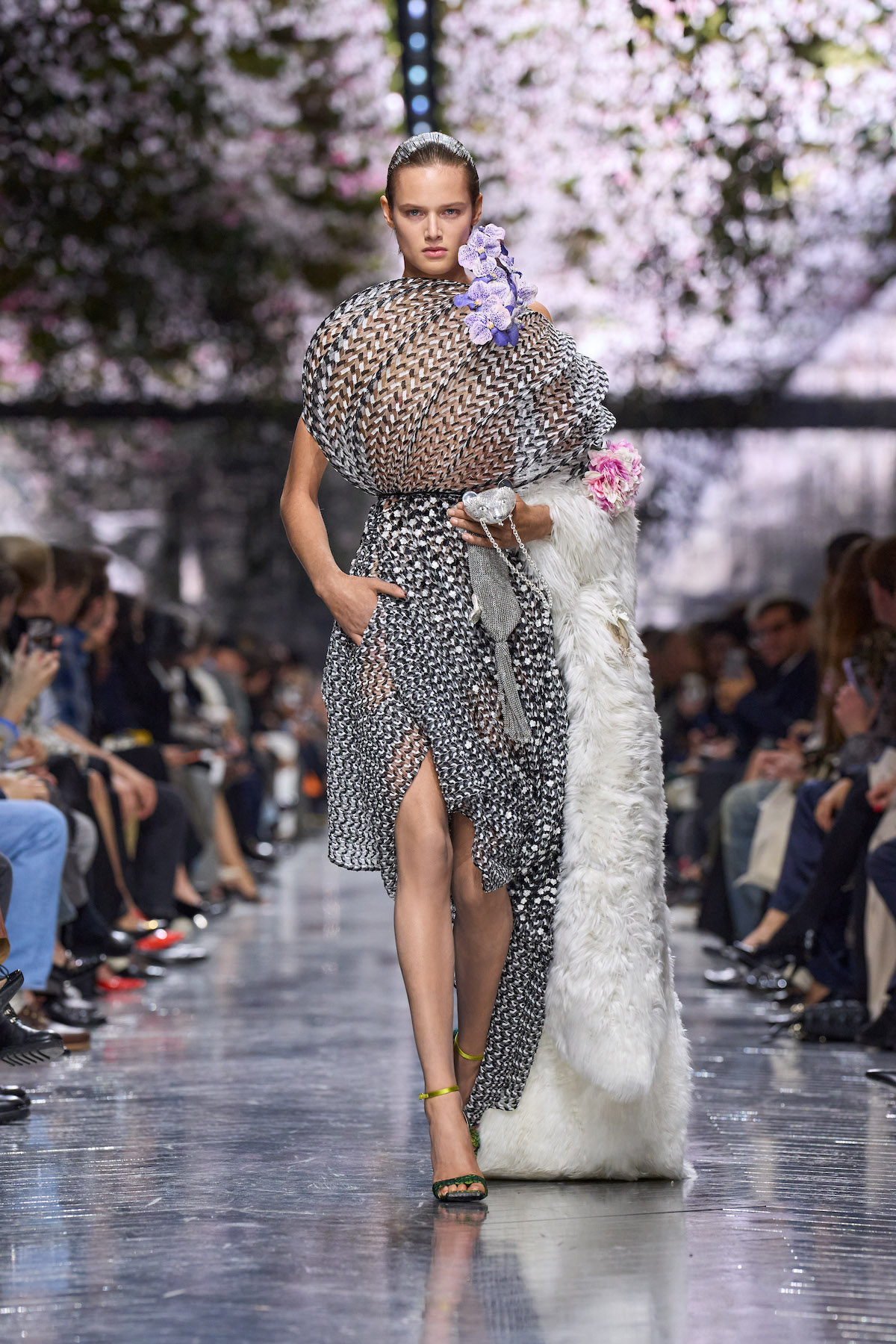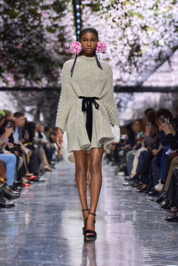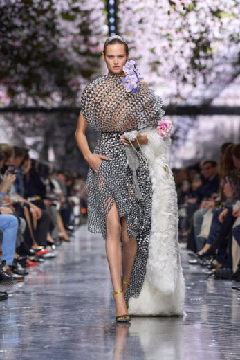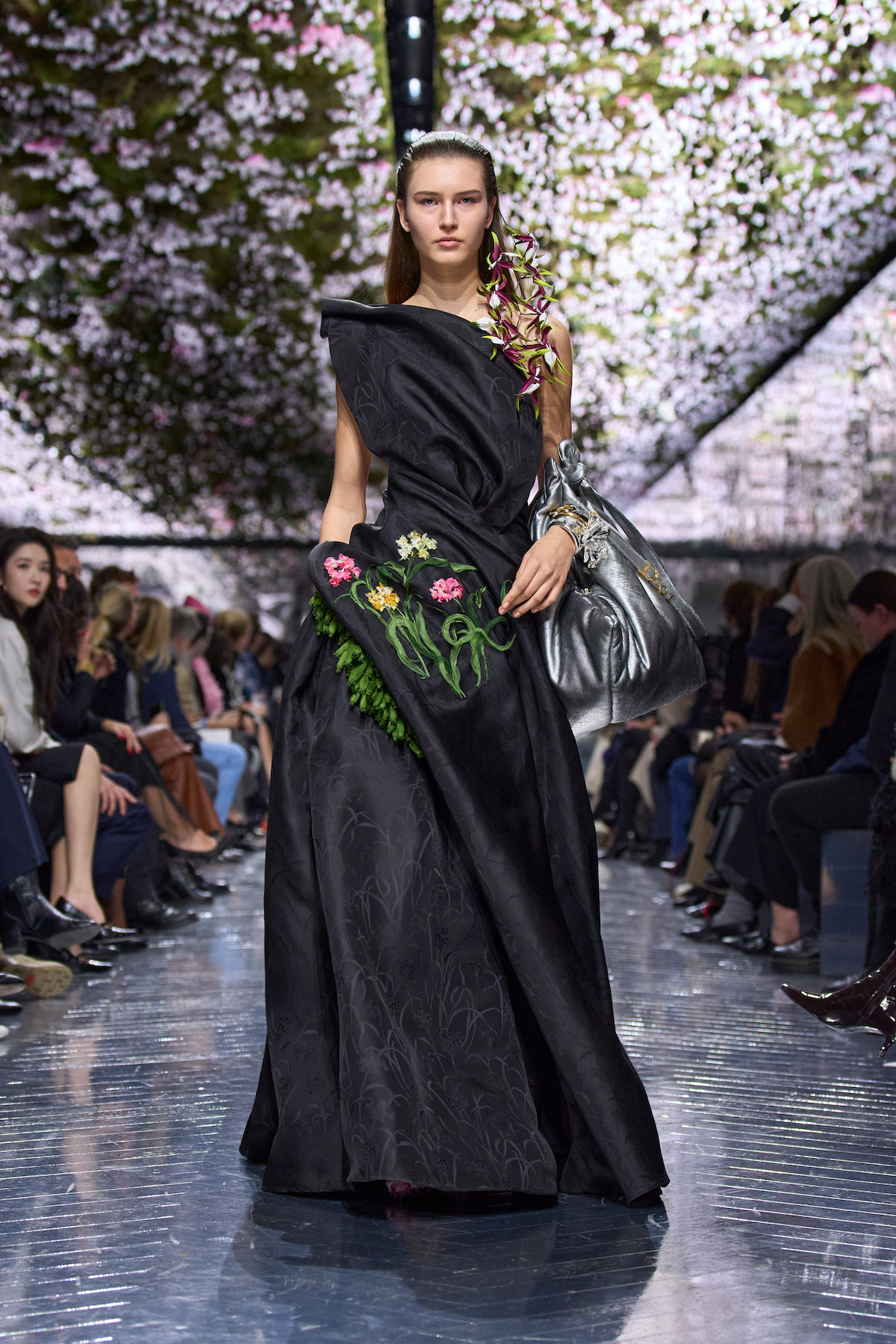 会場となるロダン美術館の天井には、“藤の花棚”を彷彿とさせるようなシクラメンの生花でびっしりと覆い尽くされている。これは、数ヶ月前にアトリエを訪れたジョン・ガリアーノがジョナサンに手渡したシクラメンの花束に感銘を受けたことが本コレクションの起点となっている。2011年に思わぬ形でディオールを追われた憧れのガリアーノから託された詩的なバトンは、オートクチュールという古典芸術を守り抜くというアンダーソンの気持ちを後押ししたことは間違いないだろう。