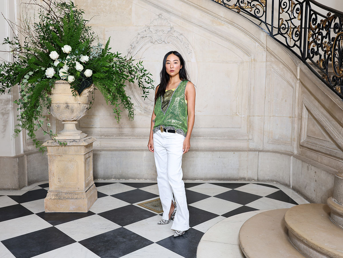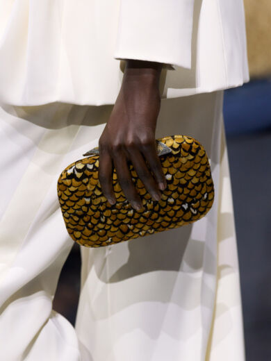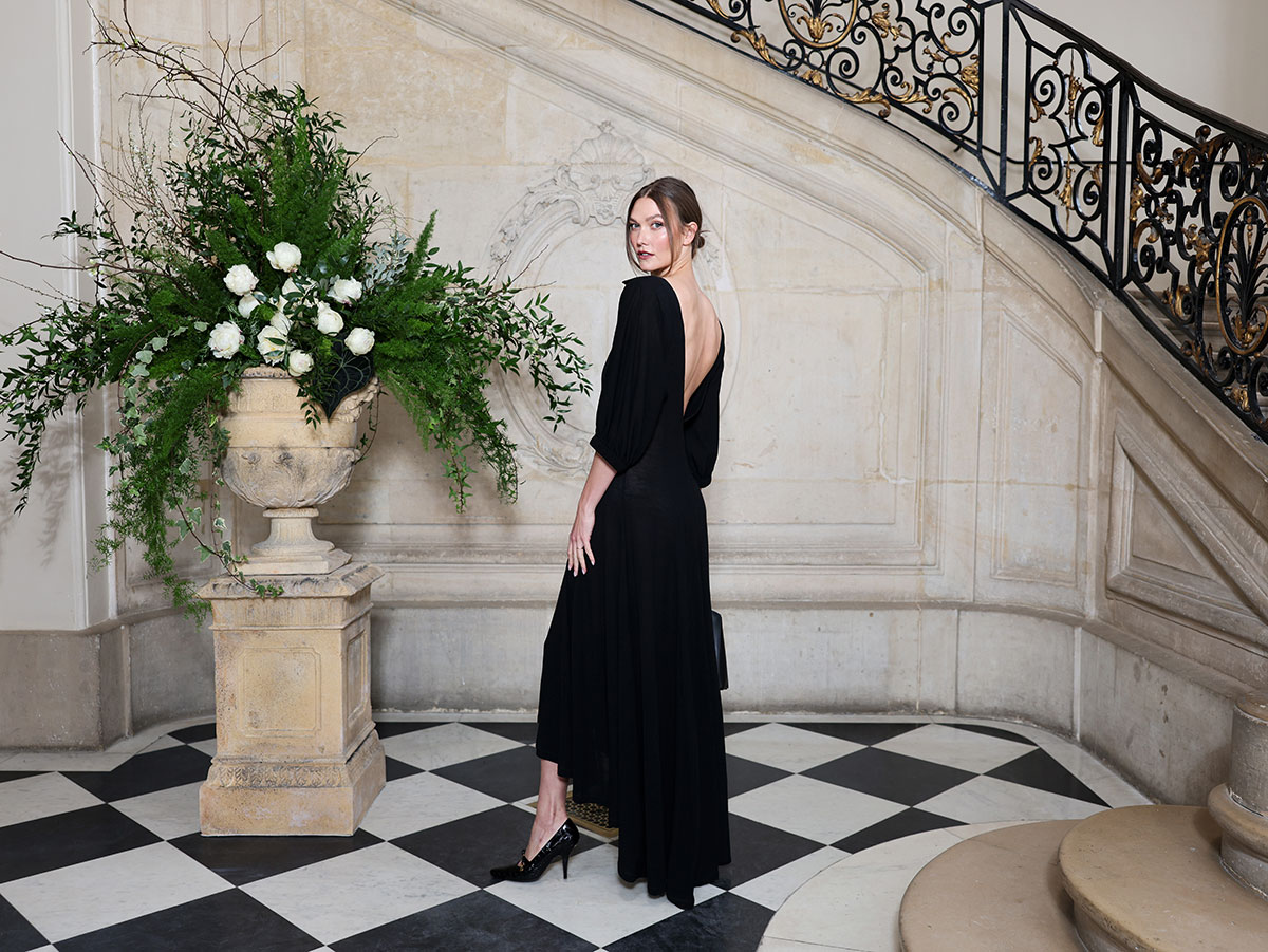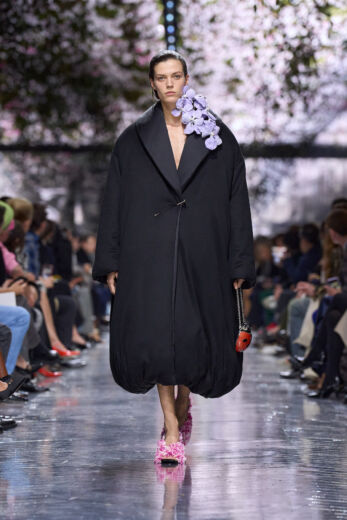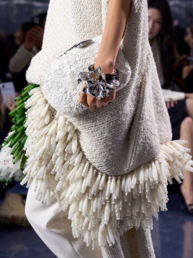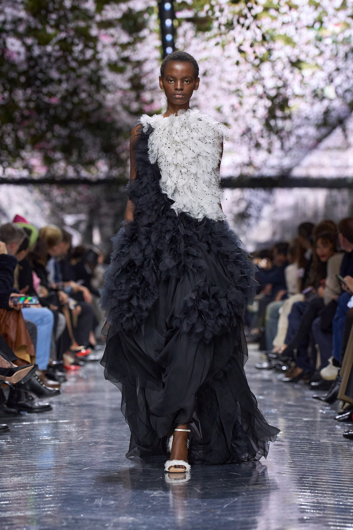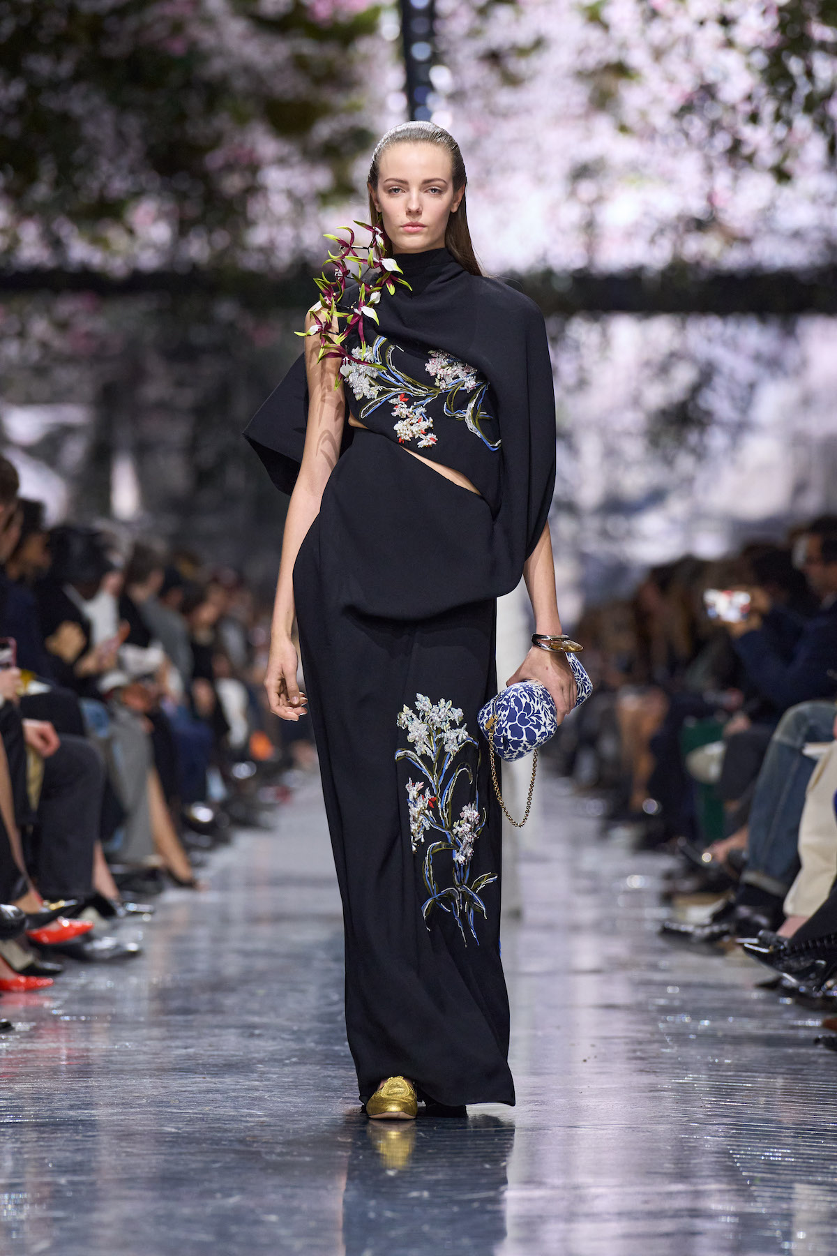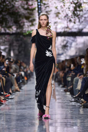 また、メゾンに通底する崇高なサヴォワールフェールも枚挙にいとまがない。ナスタリウム(金蓮花)モチーフのドレスやベルベット地のワンピースがその好例だ。前者はフリル全体に縁取りされたナスタリウムが盛り込まれたスペシャルなピースで、シフォンの軽やかなテクスチャーと僅かに寄せたギャザーが立体感を演出する。目を凝らしてようやく分かるクリスタルのベールで形作られた小さな花弁は、着る人の身体の動きに合わせてまるで蝶の羽のように揺らめくなど、細部にまで超絶技巧が宿る。後者は一見すると普通の黒いベルベット素材だが、実は白のベルベットを黒く染色したもの。腰元から足先にかけて美しいドレープが表出するのだが、芯地のホワイトがかすかに浮き出ており、ドラマティックな陰影を作り出している。