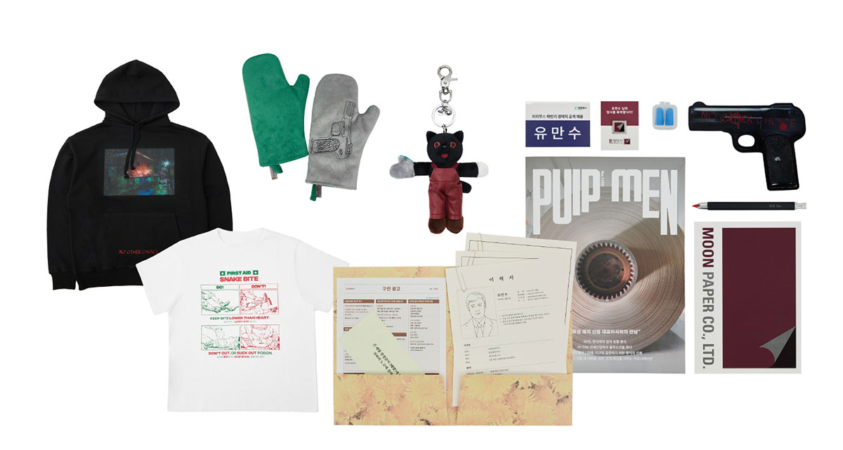 映画のオフィシャルグッズは、韓国のカルチャープラットフォーム、コンフォート(COMFORT)がプロデュース。作中で重要な意味を持つ“銃”をモチーフにしたポストカードやキッチングローブをはじめ、登場人物の人生を象徴する履歴書を再解釈したマンスリーメモリーボックス、物語の節目を印象づける赤いペンシルなど、作品に登場するモチーフや象徴を日常で楽しめるプロダクトへと落とし込んだ。コンフォートの人気アイテムである黒猫の「ピヨン」は、主人公の衣装を纏ったスペシャルバージョンで登場。さらに、アパレルアイテムやステッカーなど、作品の空気感を感じられるラインナップも見逃せない。