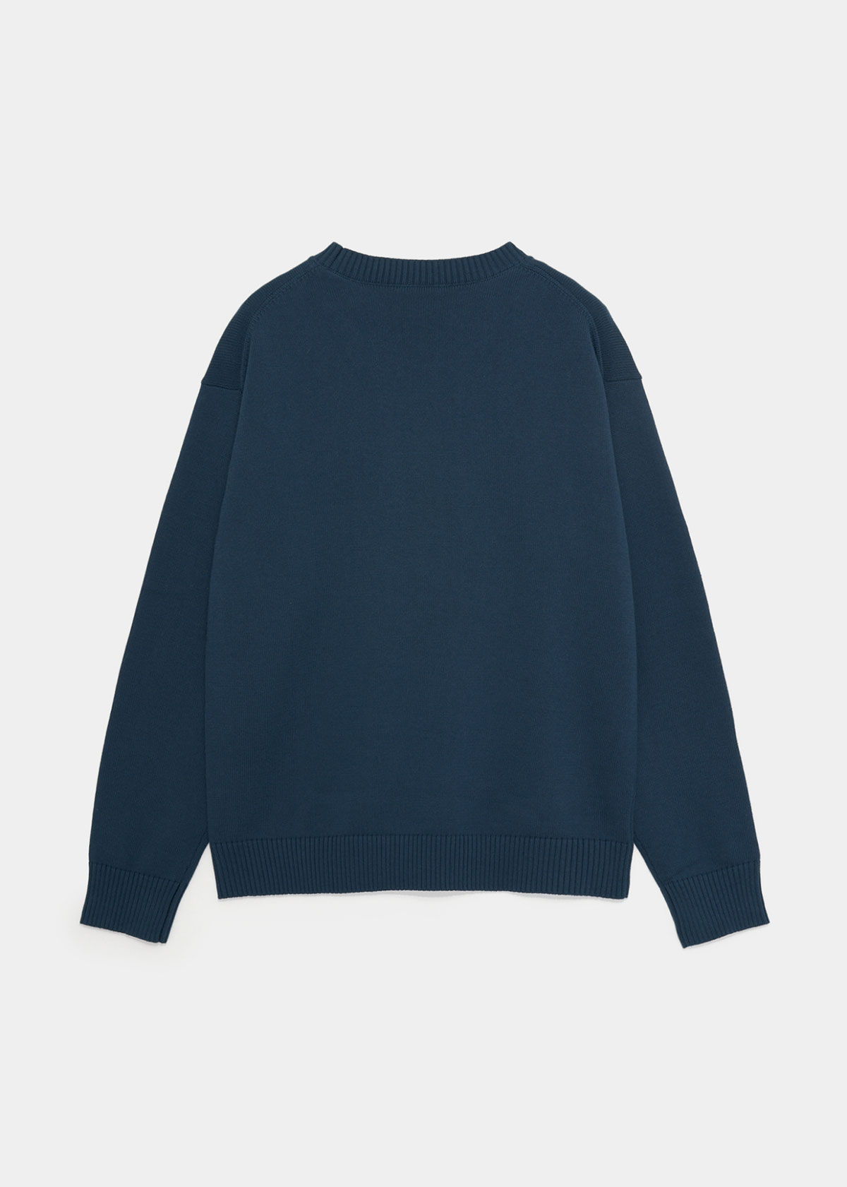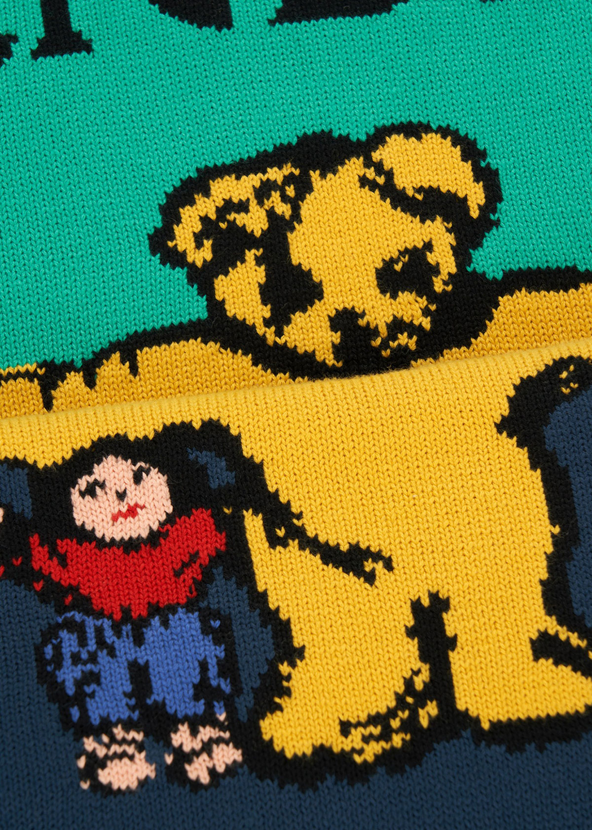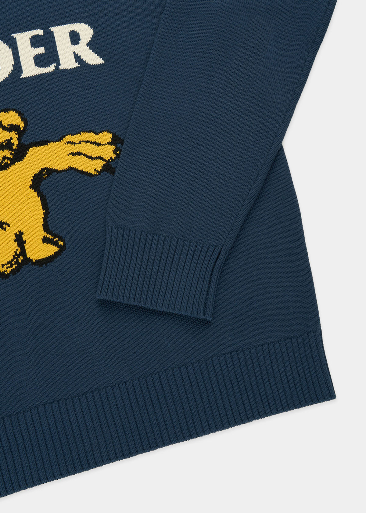今回のコラボレーションでは、我喜屋が海外の封筒に描いたコラージュ作品を原画とし、それをニットで表現。クマと子どもが両手を広げて何かを覆うような、不思議でどこかユーモラスなモチーフが印象的だ。