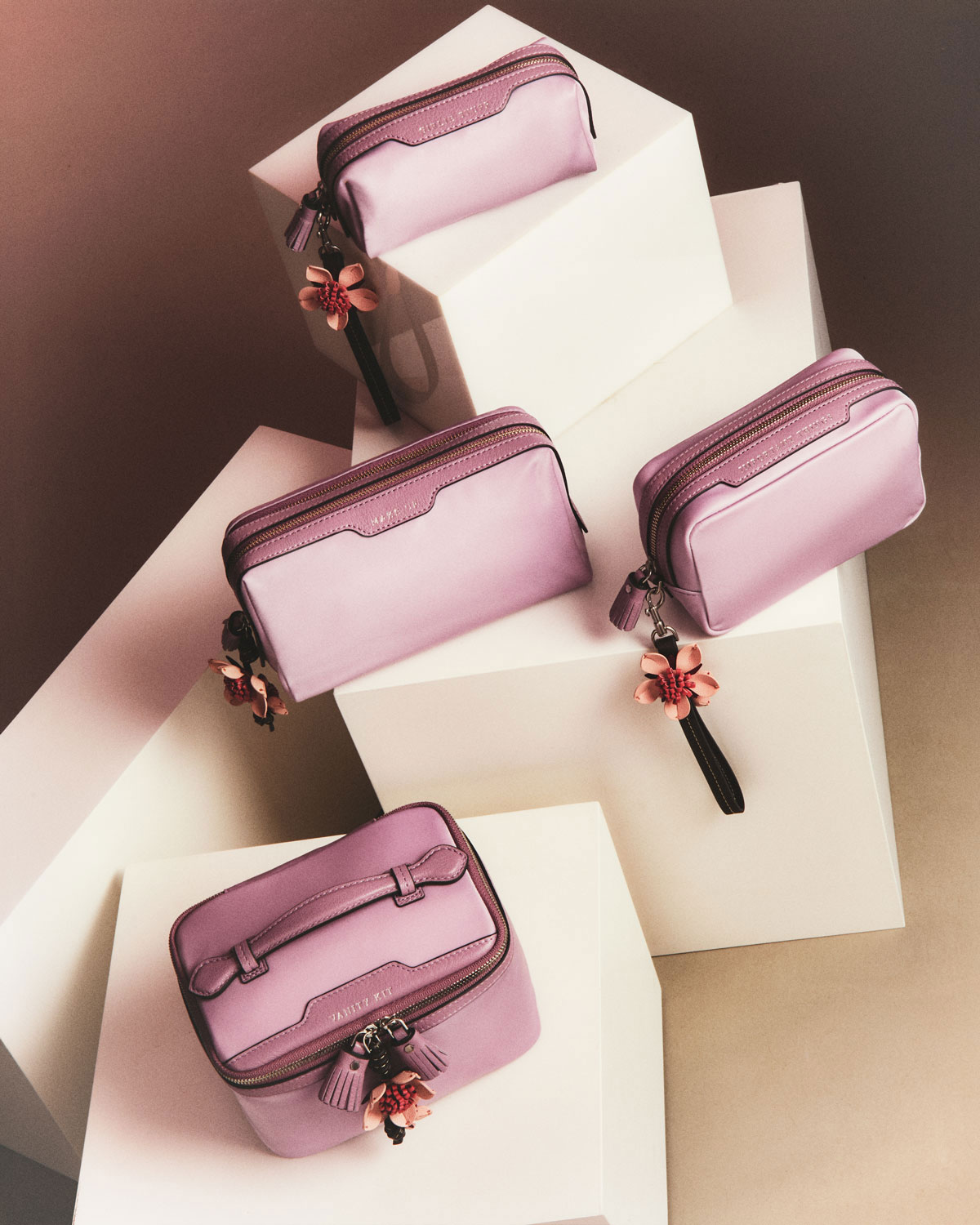 ラインナップには、アイコン・バッグである「モティマー」が2型、財布とカードケースが3型、用途を刻印した「Labelled」コレクションからもナイロン製ポーチ4型を用意。いずれもレザーでかたどった桜の花のチャームがついており、愛らしいアクセントになっている。