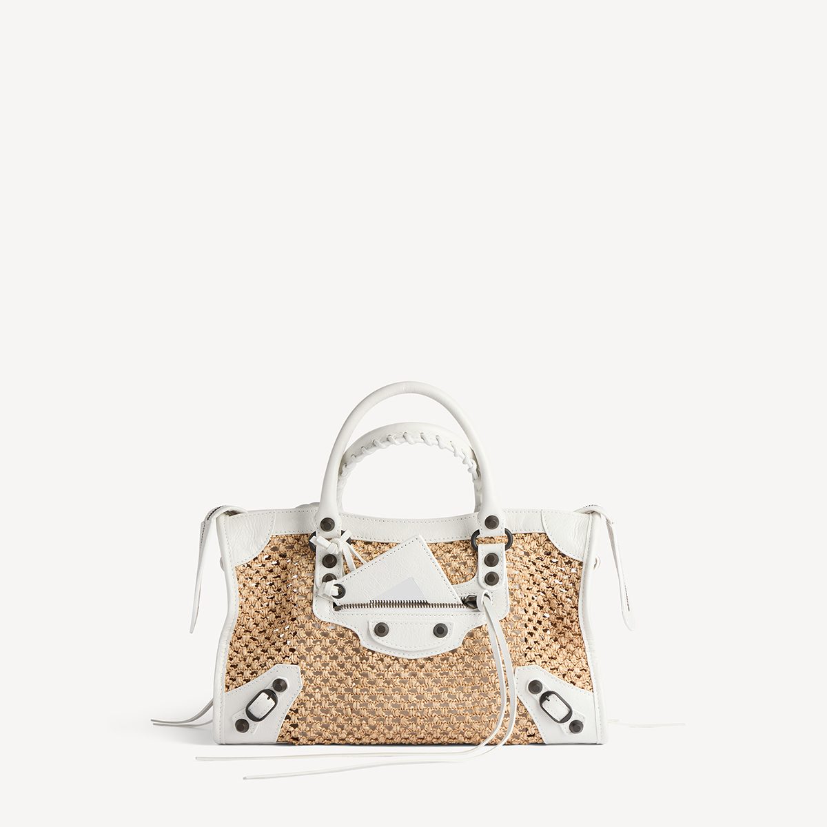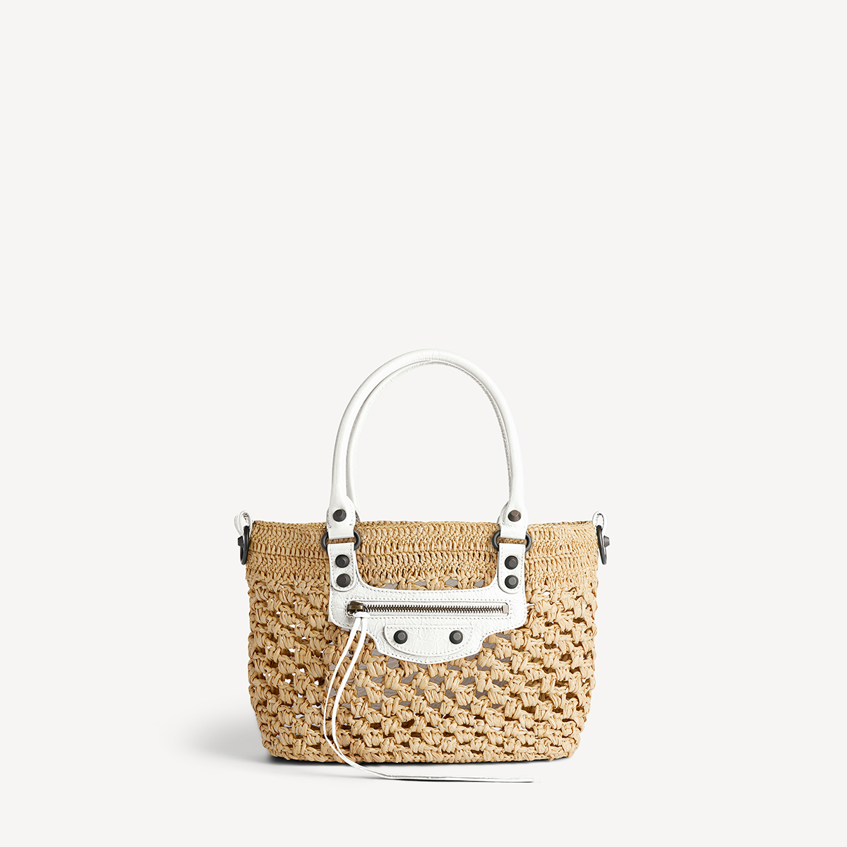 今回の先行発売では、編み込みラフィアを使用した軽やかなバスケットタイプが新たにラインナップ。しなやかなバケット型のフォルムに、ブランドを象徴するジップポケットやスタッズ、ノットストラップなどのディテールを融合し、クラシックとクラフト感を掛け合わせたデザインが特徴。また、バックルやジッパーテープ、ミラーなどを配した構築的なモデルも展開され、アイコンバッグの魅力を現代的に再解釈している。