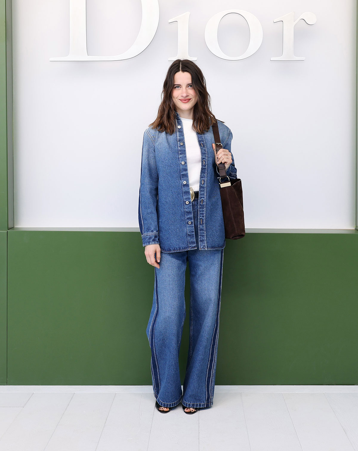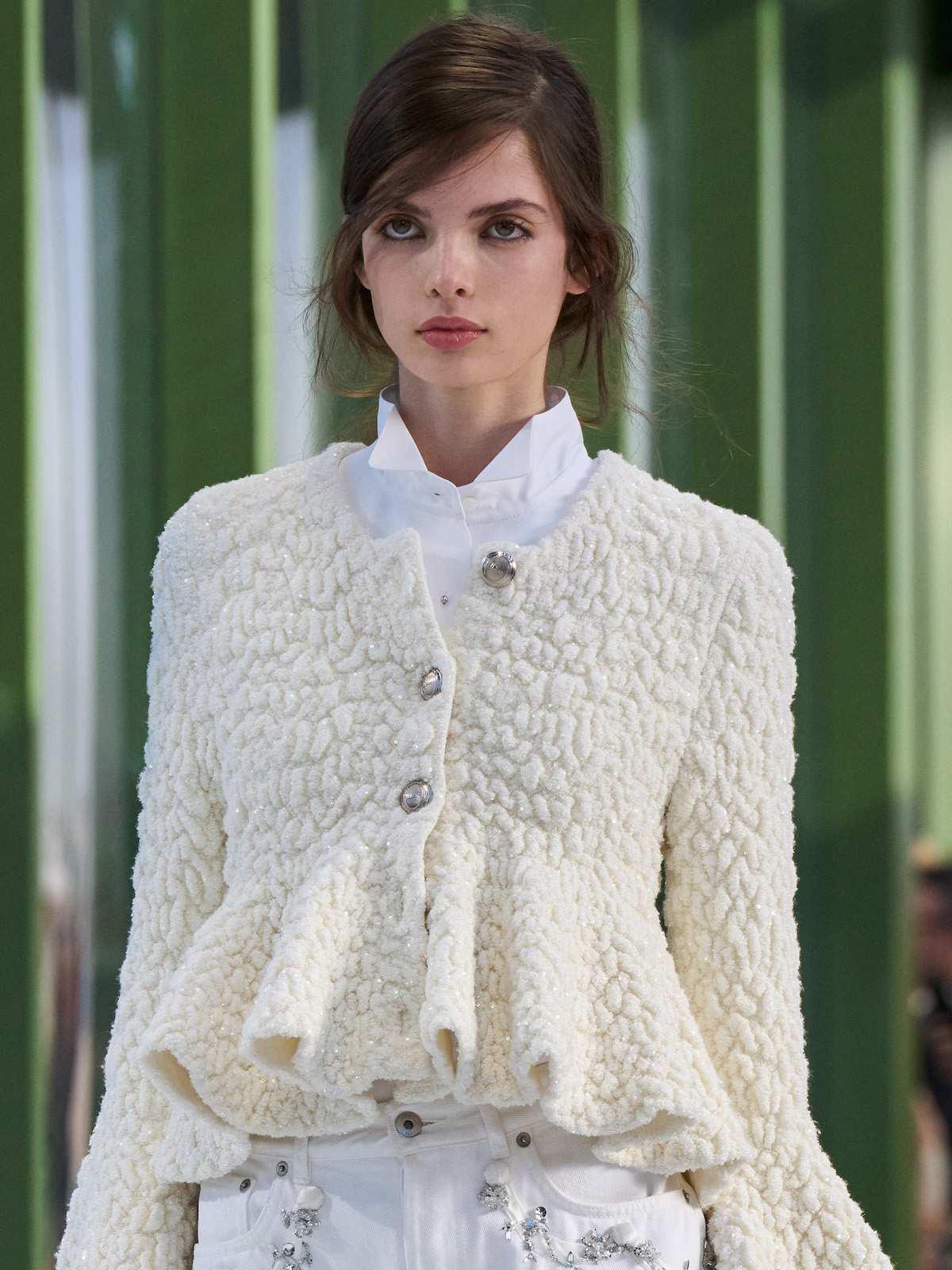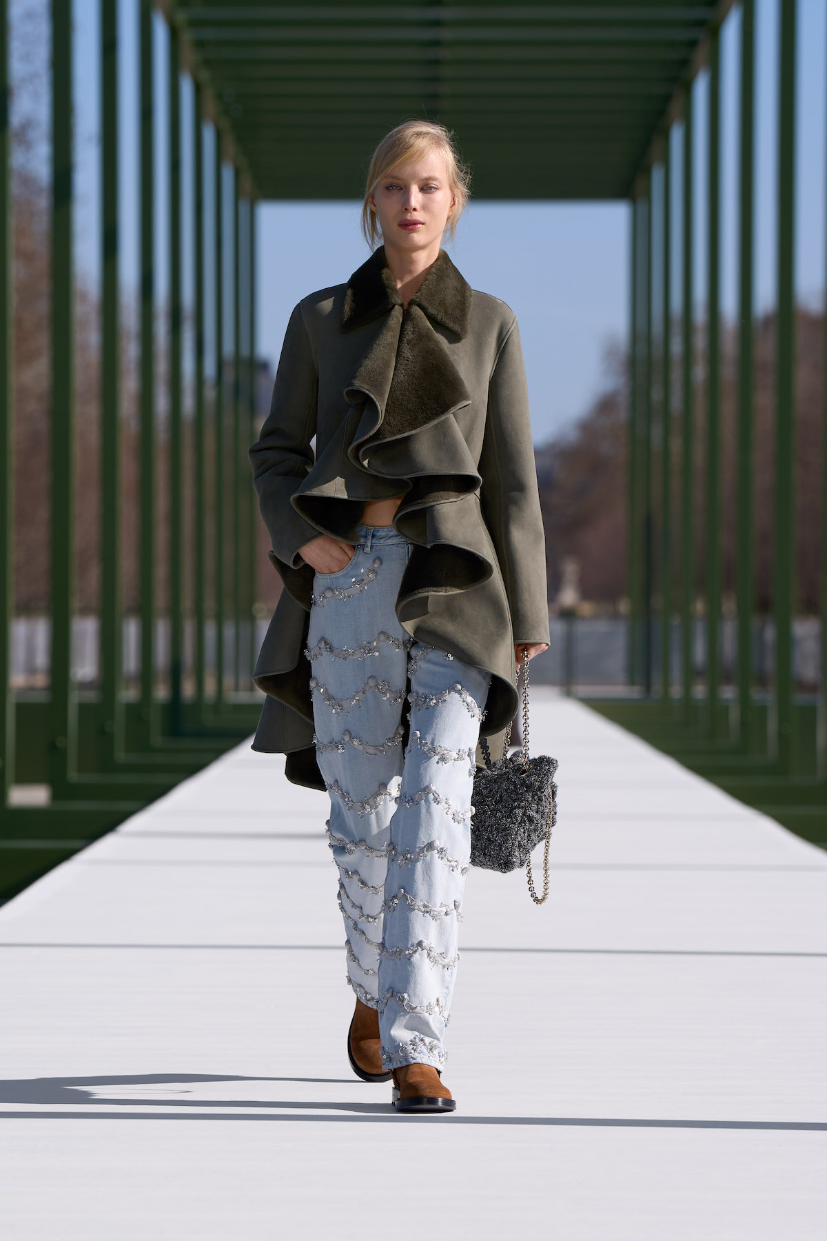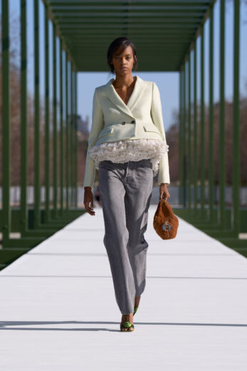 他にもアンダーソンの特徴でもある「ドレスアップとカジュアルダウンに象徴される相反するものの駆け引き」は、今回も多方に見て取れる。デニム地のティアードスカートもその好例だが、出色だったのが終盤に登場したダブルブレストのジャケットにフェード感の強いワイドシルエットのデニムを合わせたルックだ。別布で切り替えたピークドラペルのジャケットに微かに現れるネップのような表情は、スパンコールを散りばめたもので、ハンドルに手を通さずラフに掴んだハンドバッグも含めて、エフォートレスなムードが時代の空気感と呼応する。