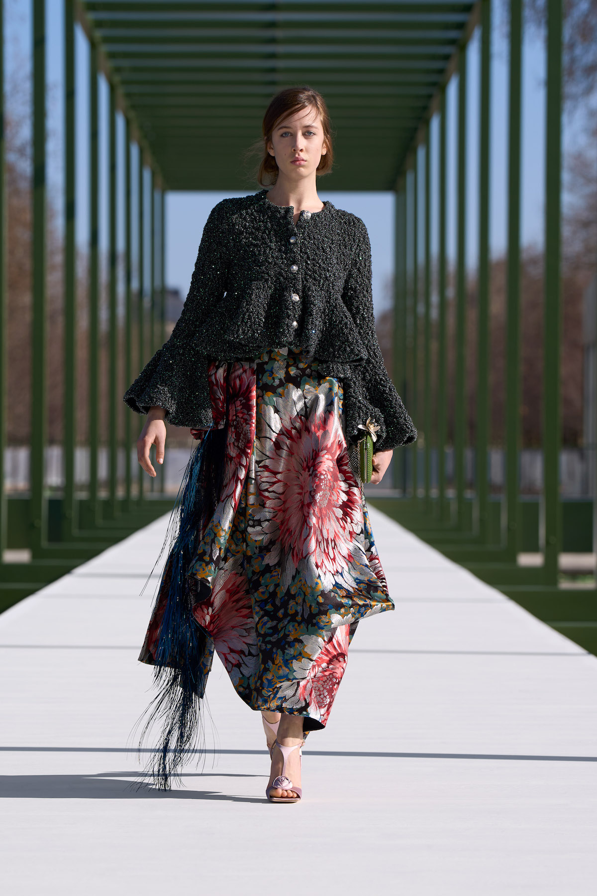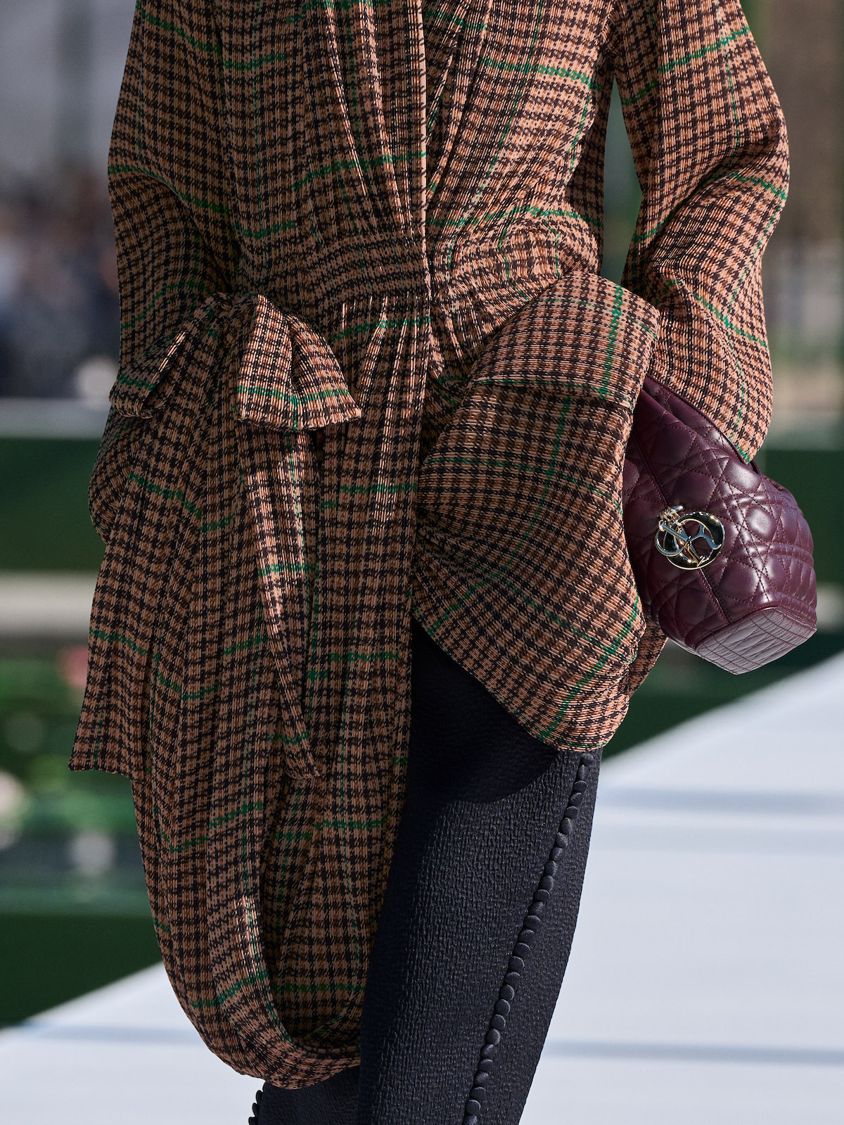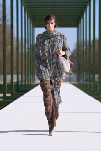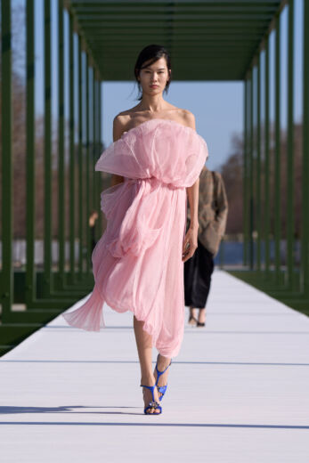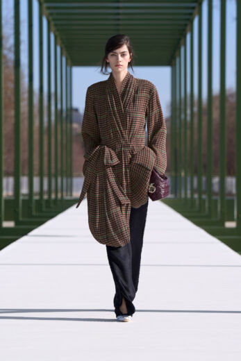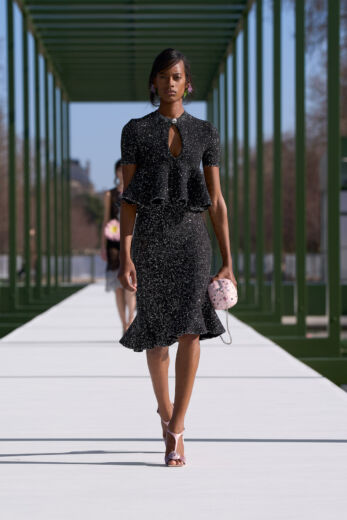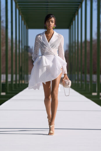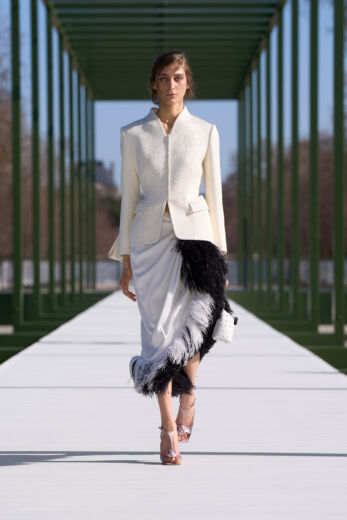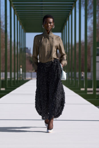 抑制を効かせた弦楽器の調べが徐々に高揚感を高めるSentieri Selvaggi, Carlo Boccadoro & Emanuele De Raymondiの『Triptyque』が流れると、ショーはスタート。ファーストルックは、ポップコーン編みのような表情感のあるニットトップスにチュールスカートを組み合わせたドレス。キュッと締まったウエストから裾に向かって広がるペプラムは、メゾンのアイコンピース「バー」ジャケットを再解釈したもの。ティアードになったフリルの一部には小さなビジューがあしらわれており、銀のテープのトリミングも相まって、1949年オートクチュールコレクションで披露された「ジュノン」ドレスを想起させる。また、ティアードフリルは、ウェディングドレスのバッスルのように裾を引きずるほど長くボリューミーで、歩くたびにふんわりと揺れるバックシャンにロマンティックな余韻を残す。その後、カラーは異なるが、スカート部分が同一デザインのドレスが続くと一転、ガンクラブチェックのジャケットと共地のストール、パンツを合わせたルックが登場。風を孕んだような軽やかなテクスチャーとゆとりのあるシルエットが、クラシカルな柄行きをコンテンポラリーに魅せている。