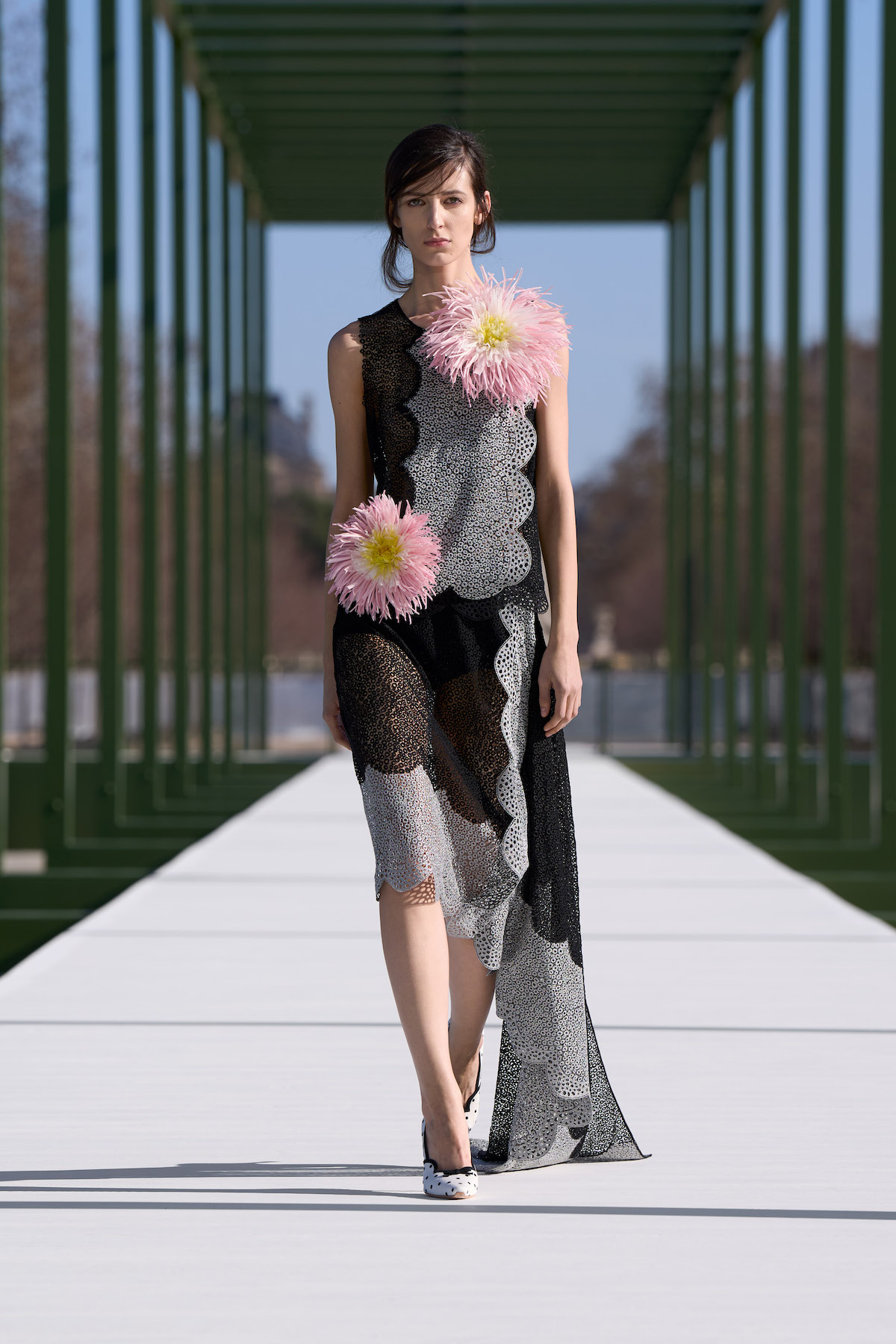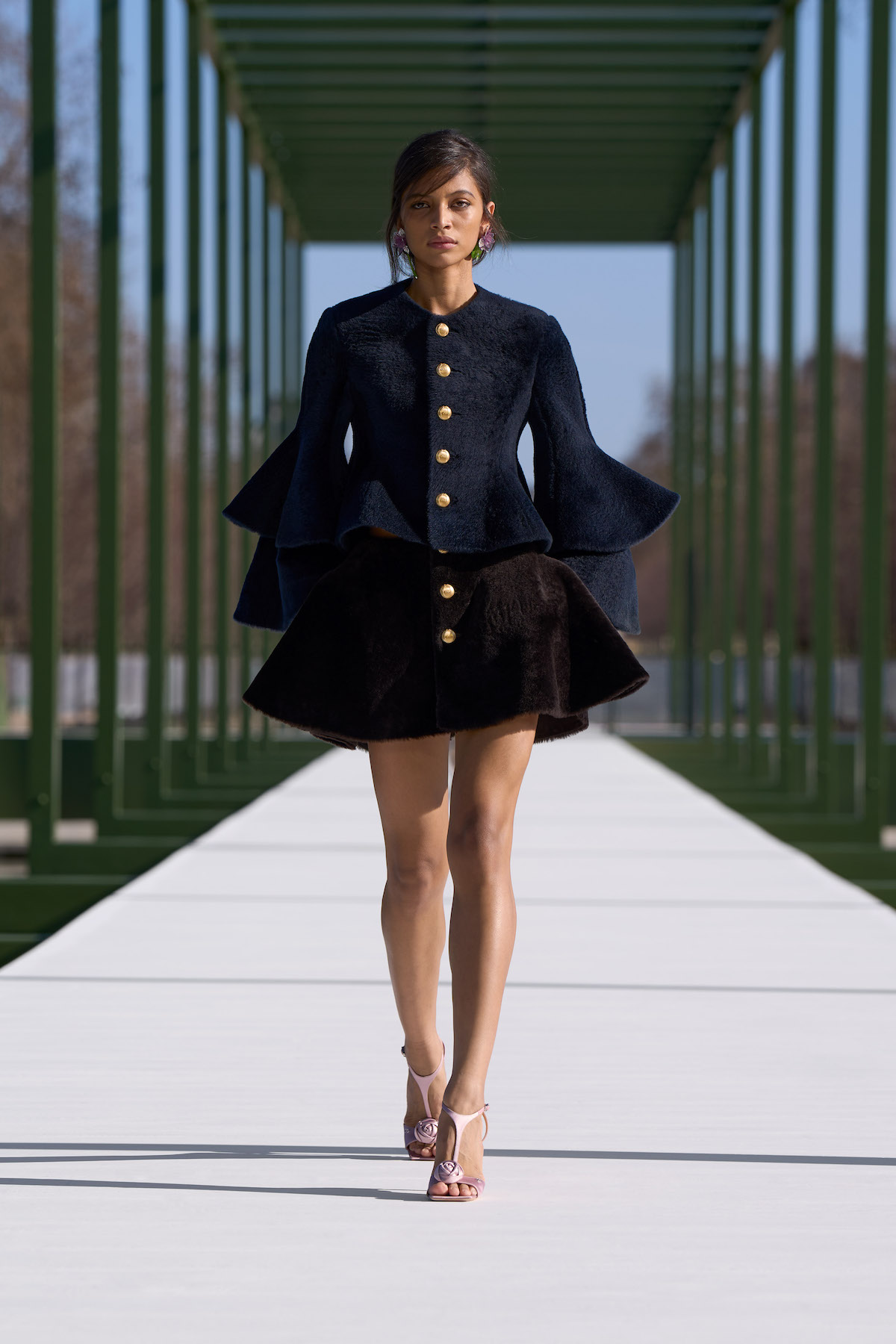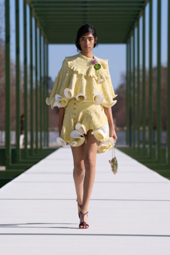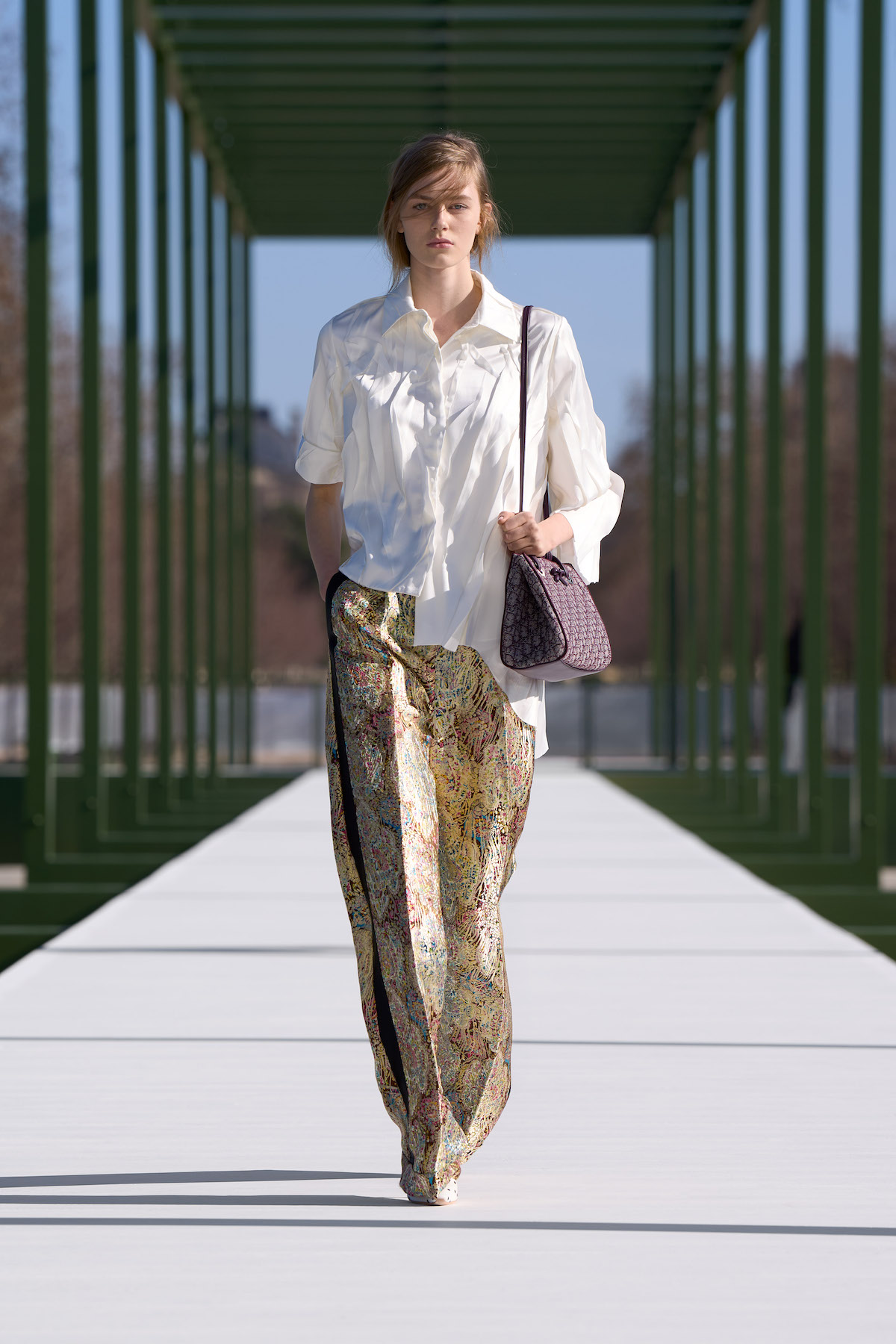 本コレクションの会場となったチュイルリー庭園は、今から450年以上前にカトリーヌ・ド・メディシス女王によって建設が命じられた由緒ある庭園。ルイ14世による再設計を経て、1667年には一般市民にも解放されたが、訪問者に厳格なドレスコードが要求されたという。当時から現在に至るまで、この場所を訪れるすべての人たちが「観察者」であり、散策すること自体が一種のパフォーマンスと化すという点においては、誰もが等しく「見られるため」の舞台でもあったのだ。アーティスティック・ディレクターを務めるジョナサン・アンダーソンにとっても創造性を掻き立てるこの場所を、ショーステージとしても機能させるために庭園内に回廊型のセットを配置。自然豊かな庭園内にあえてイミテーションの公園を作り上げた。
