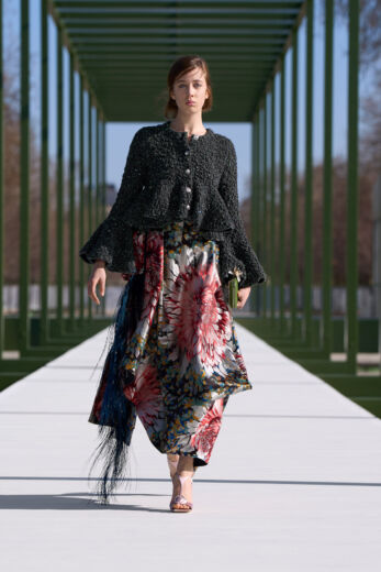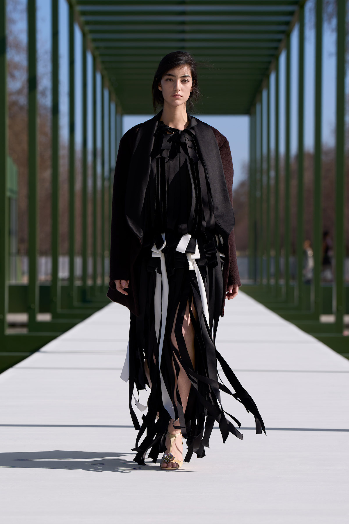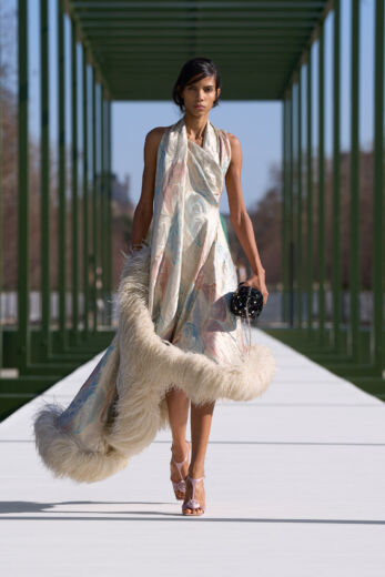 なかでもアンダーソンのデビューコレクション以来、メンズ、ウィメンズともに多用されている“デルフト”ドレスからの引用は今回も登場。パネルを幾重にも重ねてボリュームを出したディテールは、ジャケットのヘムラインにアクセントを添えたり、アウターのフロントデザインやドレスの後ろ身頃などにも取り入れられていた。また、前任者のマリア・グラツィア・キウリが多用していたモチーフのひとつで、ムッシュ・ディオールも愛したリボンやボウ(蝶々結び)は、アンダーソン就任以来、やや控えめな印象であったが、本コレクションではサテンのリボンを縦使いしてフリンジに応用。リボンの結び目で不規則な流れを生むフリンジが、歩く度に足に絡んでは離れるさまはプリミティブな躍動感を覚えた。