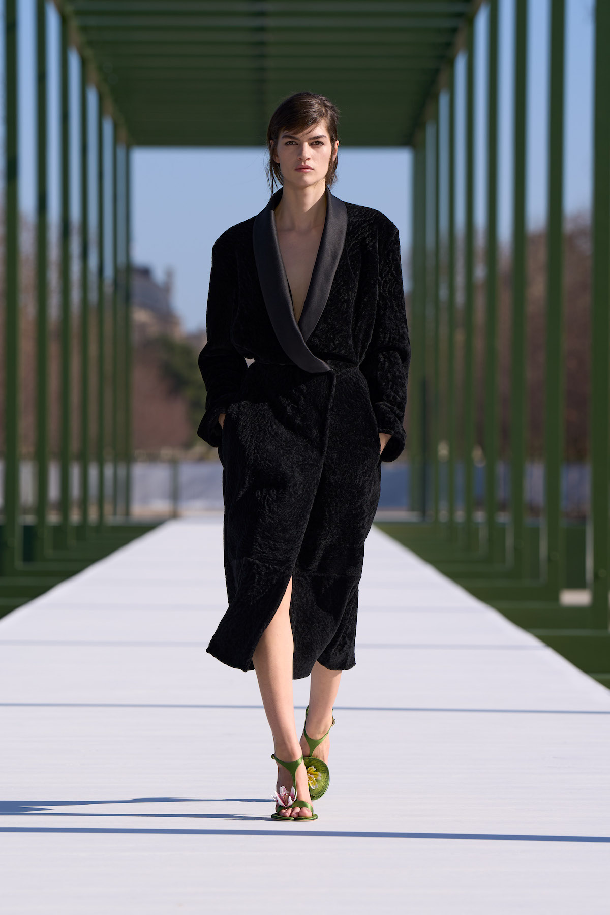 ガンクラブチェックは、その後も裾部分に分量をたっぷりとってドレープを形作ったローブジャケットなどにも採用。また、今年1月のメンズコレクションでも披露されたポール・ポワレから着想を得たブロケードは、今回もジャケットやドレスなどにも用いられた。シルクのような光沢感のある生地に、金糸を使って織り上げた精緻な色柄は、本コレクションのインスピレーションにも寄与したルイ14世によって隆盛を極めた豪華総覧なバロック様式に通ずるものがある。他にも、素材やカラーなど、バリエーションで披露されたラペルをサテンで切り替えたスモーキングジャケット風のロングコートも目を引いた。ベルベットの質感やVゾーンから大胆に肌を覗かせたセンシュアルなルックは、無造作なヘアスタイルや足元に合わせたTストラップパンプスという一見“チグハグ”な組み合わせによって、エレガンスなムードをノンシャランに中和する。