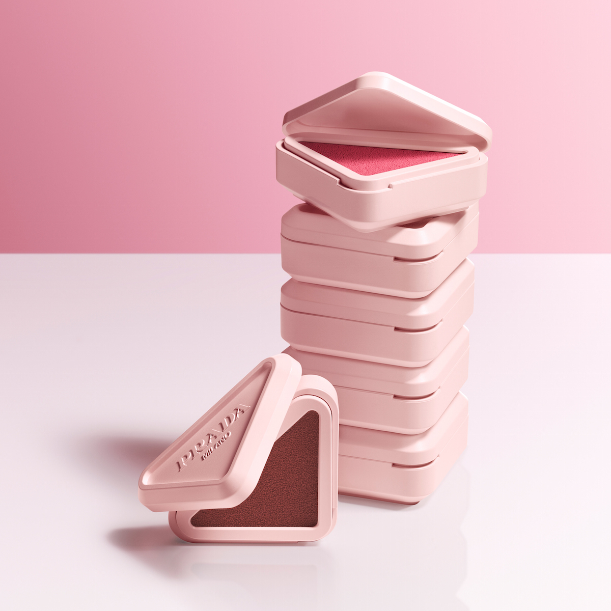 プラダを象徴するトライアングルのパッケージは、製品をつなげて積み上げることもできるユニークな仕様。軽やかな”タッチ”で血色感を与えるフォーミュラは、チーク、リップ、アイを単色で仕上げるモノカラールックから、気分やシーンに合わせて色合いを組み合わせるレイヤリングルックまで思いのまま。
