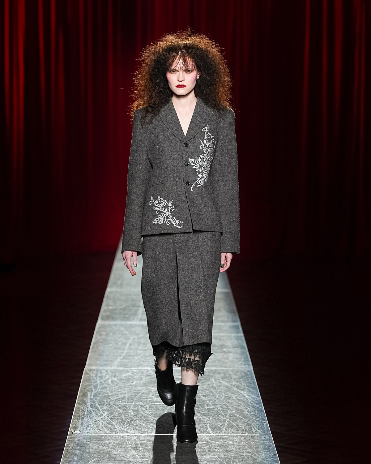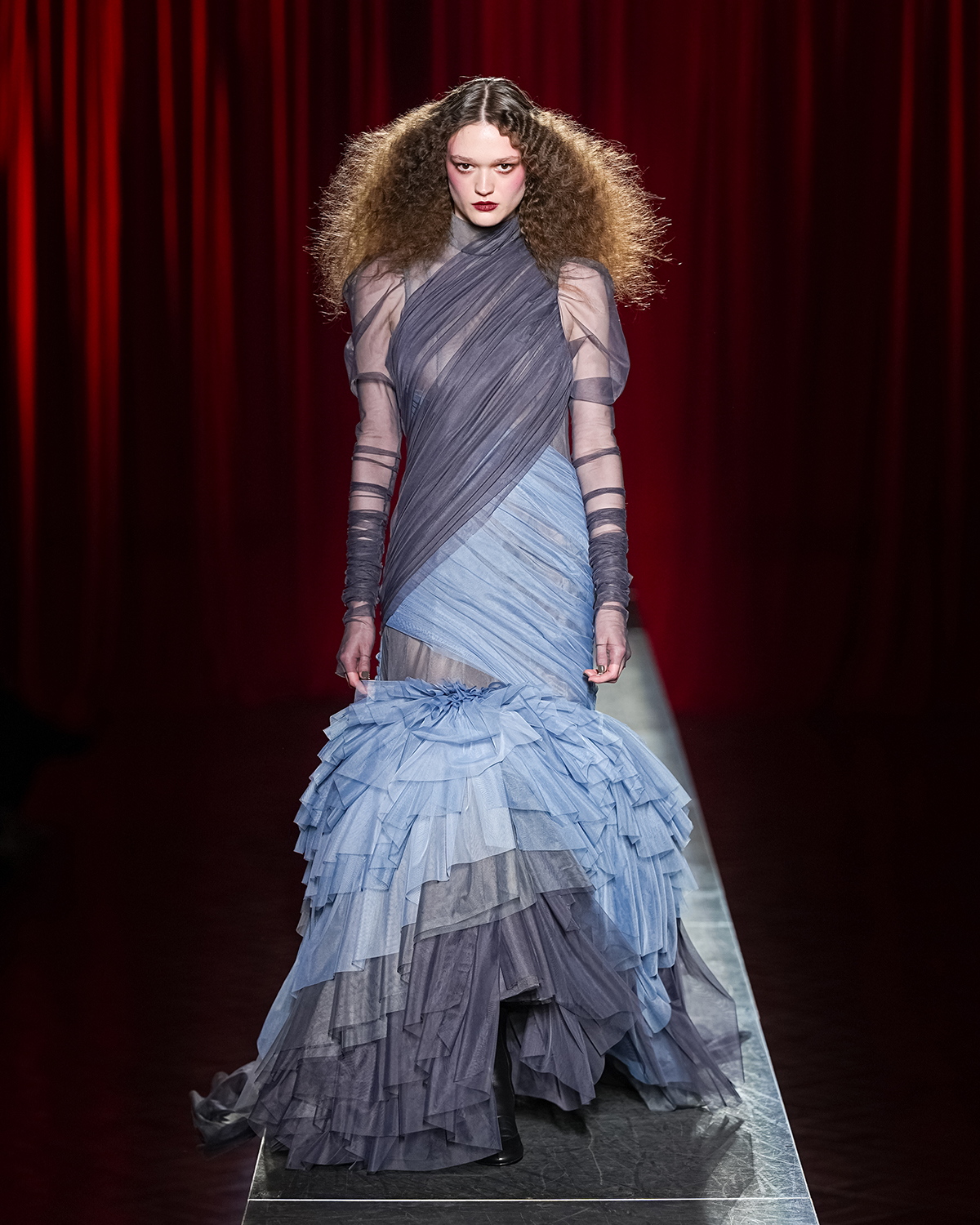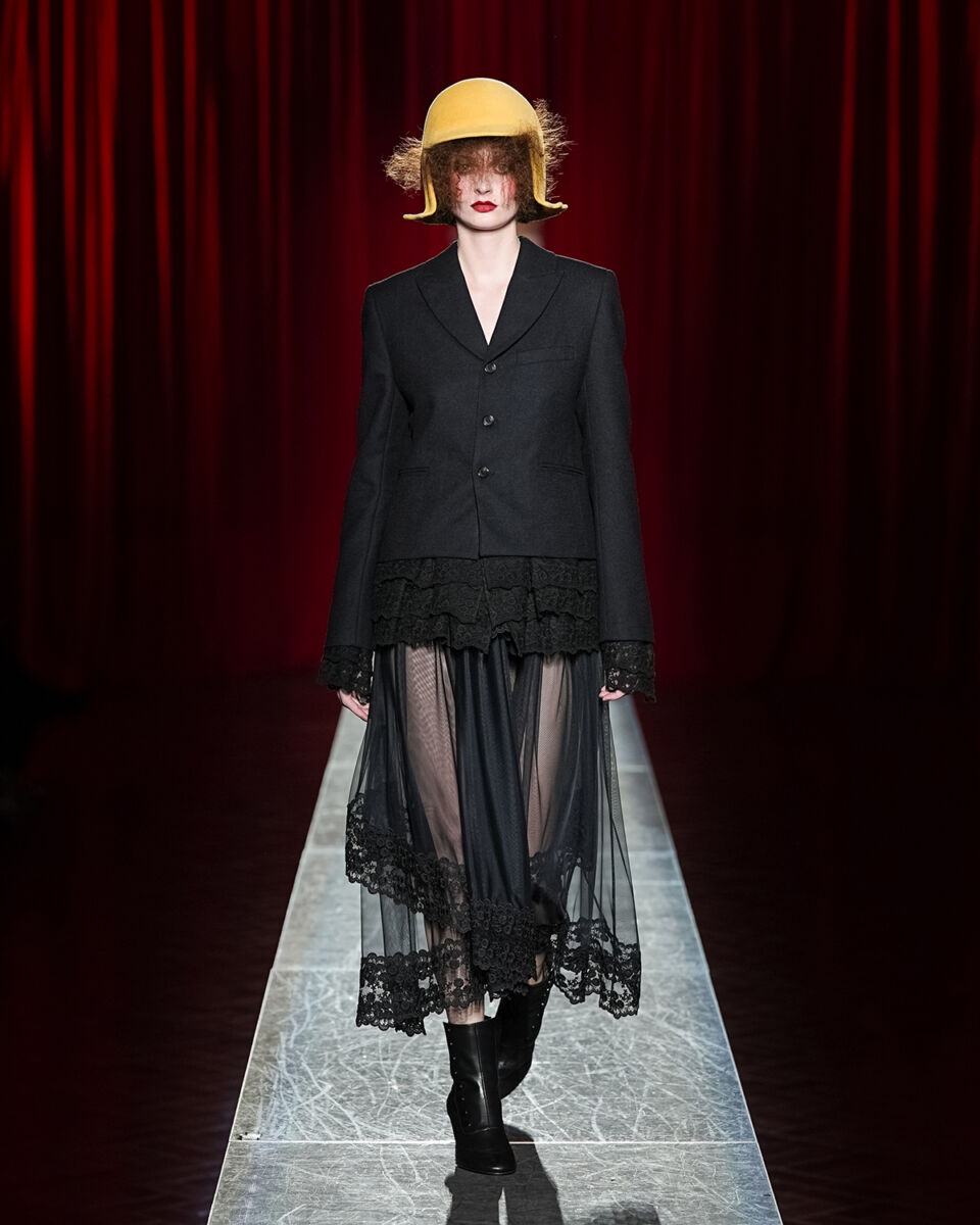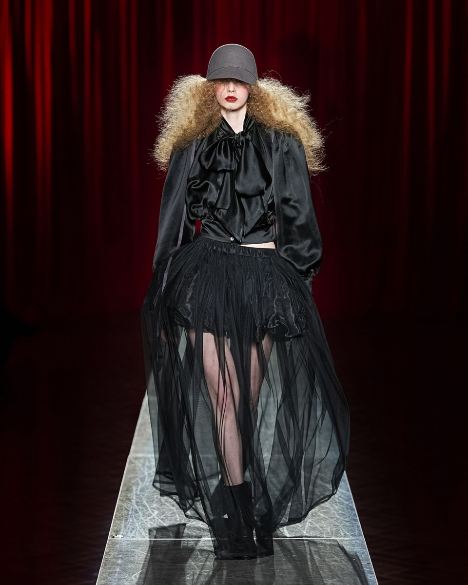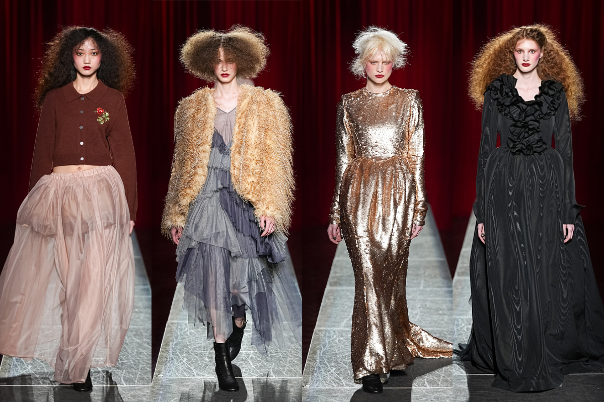 ヴィヴィアーノといえば、チュールやフリル、リボンといったロマンティックなディテールが象徴的。今季はそのアイコンを生かしつつ、パワーショルダーやウエストマーク、テーラードジャケットといった構築的なシルエットを際立たせることで、全体に重厚なムードを漂わせた。