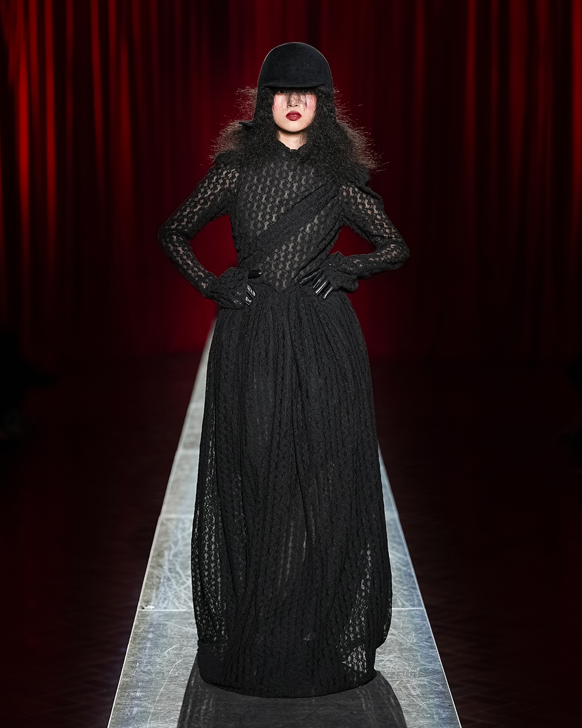 そして、本コレクションでひときわ目を引いたヘッドピースは、「キジマ タカユキ(KIJIMA TAKAYUKI)」とのコラボレーションによるもの。フライトキャップをベースにしたスポーティなタイプと、ボブヘアのウィッグをイメージした遊び心あるデザインの2型が登場し、ルックにさりげない違和感とアクセントを添えた。