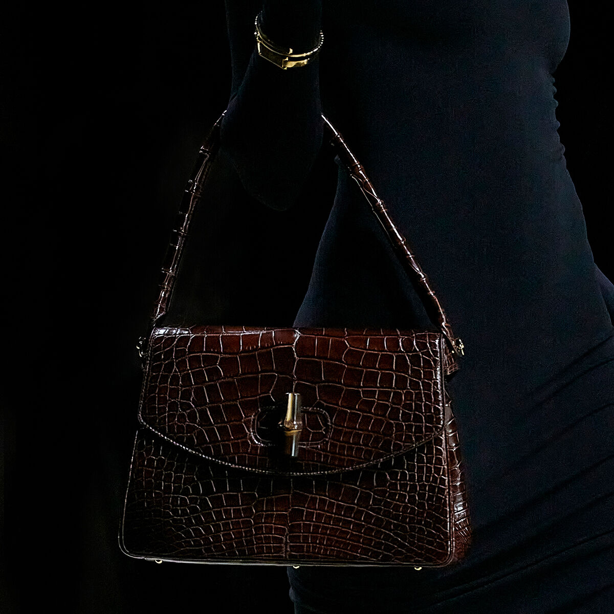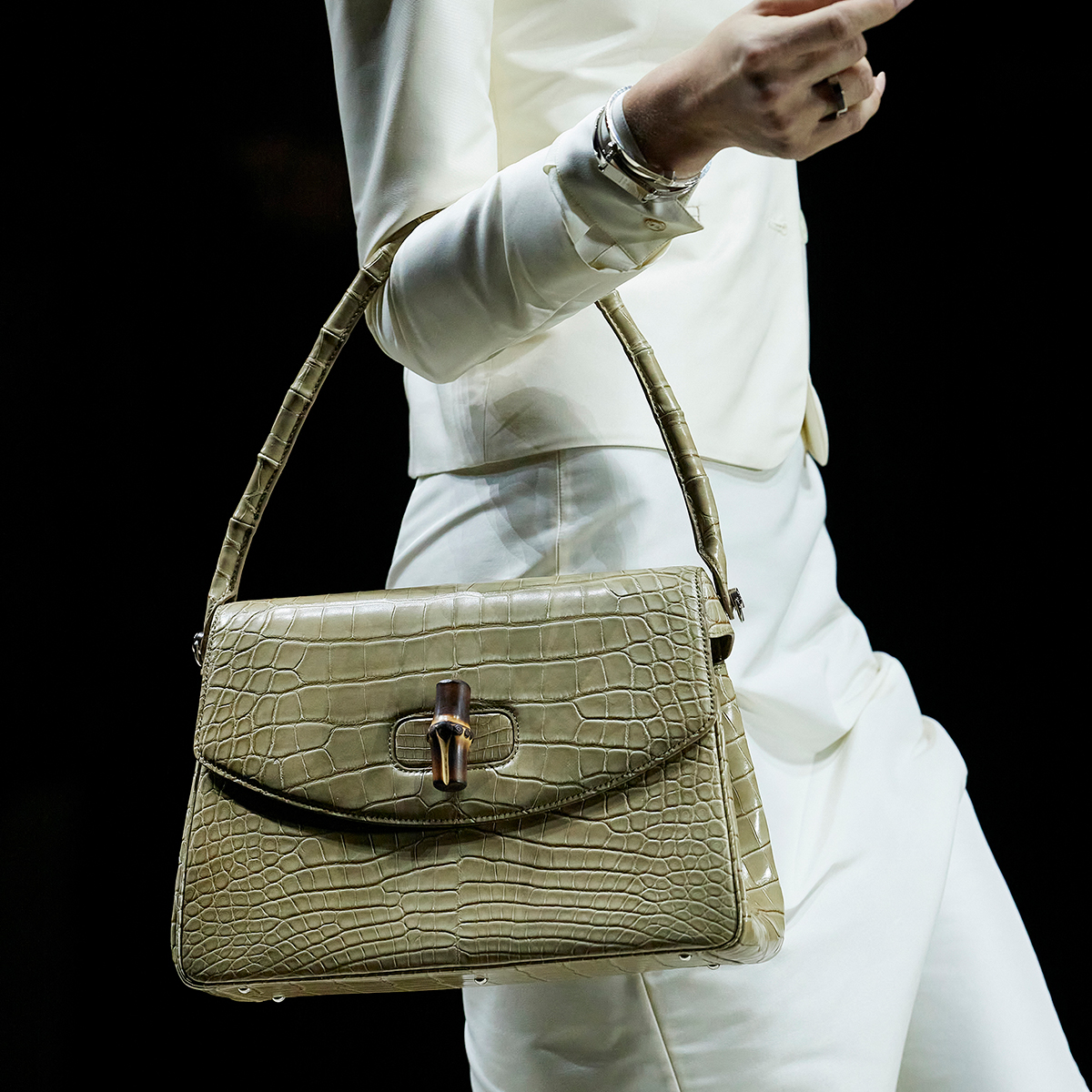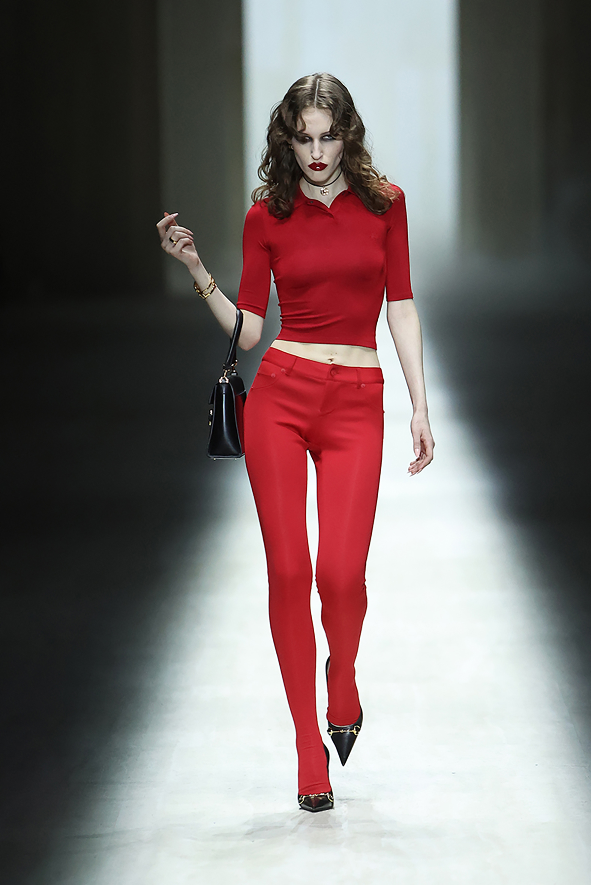 ショーのラストを飾ったのはケイト・モス。大きく背中の開いた光り輝くブラックドレスに、10カラットのダイヤモンドをあしらったホワイトゴールド製のGGタンガを配したデザインは、官能性と緊張感を同時に体現し、今季のテーマを象徴的に締めくくった。