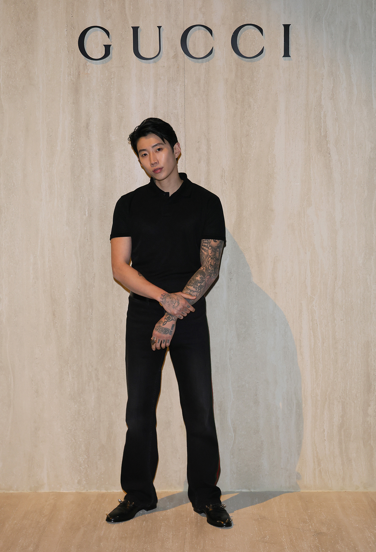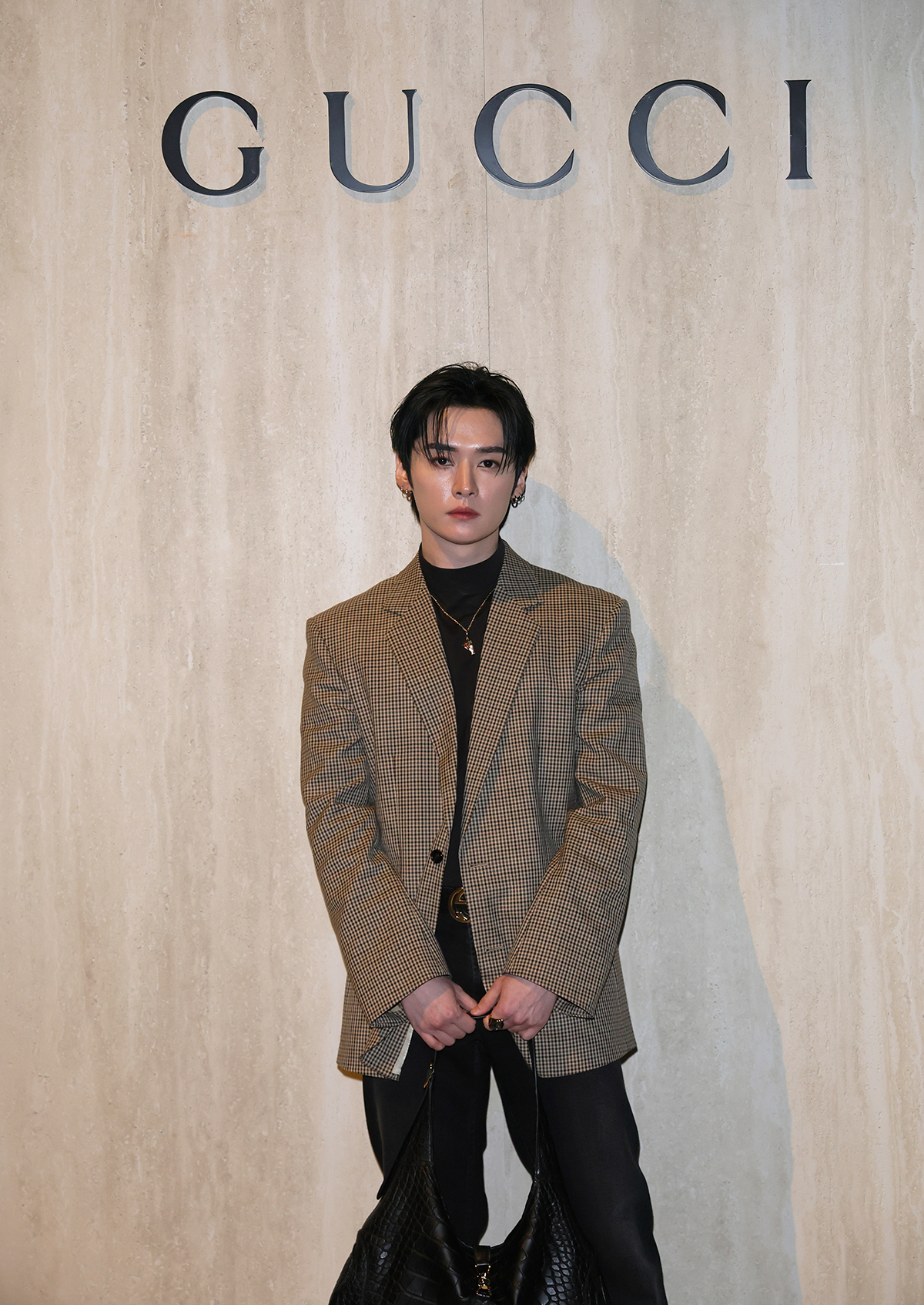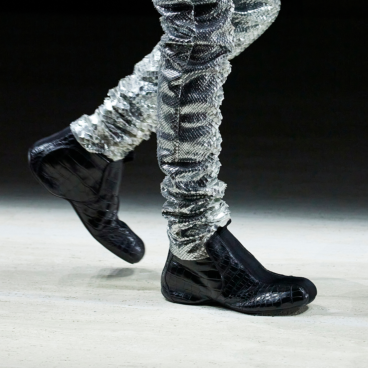 ショーのラストを飾ったのはケイト・モス。大きく背中の開いた光り輝くブラックドレスに、10カラットのダイヤモンドをあしらったホワイトゴールド製のGGタンガを配したデザインは、官能性と緊張感を同時に体現し、今季のテーマを象徴的に締めくくった。