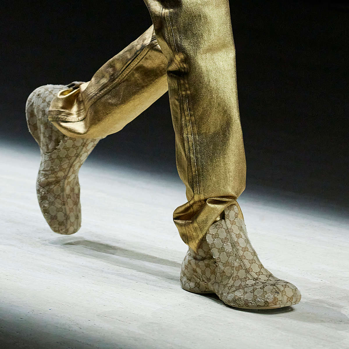 今季は小物にもデムナの意志が息づく。アイコニックな「グッチ バンブー 1947」は、複数のレザーを組み合わせたしなやかなバンブーハンドルを備え、より直線的なフォルムにアップデート。シューズはグッチ初となる新作スニーカー「マンハッタン」が誕生。ハイカットのバスケットシューズを思わせるフォルムに、ローファーのようなスリッポンの軽快さを融合させた一足は、身体に寄り添う機能性と造形美をバランスよく併せ持つ。