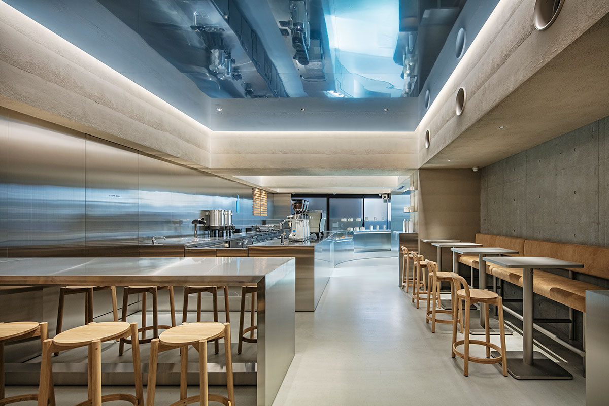 カフェの空間デザインは、TEKI DESIGNの西永竜也が担当。入口に配されたステンレスのファサードが店内へと連なり、街の気配をそのまま引き込む設えに。さらに、左官の積層壁や天井には青く反射する素材を用い、街の中にいながらくつろげるモダンな空間を演出している。