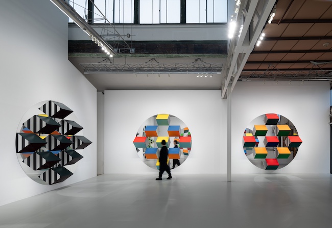 本展では、6点におよぶビュレンの新作『Prismes et mirroirs : Haut-relief(プリズムと鏡 :高浮き彫り)』が公開。インダストリアル・カラー・パレットからランダムに選ばれた色彩が“、「Prisme」と作家が呼ぶ凸状の形態に塗布され、鏡面様の支持体の上に配置されている。作品が置かれる環境と作品との関わりについて考察を続けているビュレンの、「光」や「反射」への深いアプローチとも言えるだろう。なお代名詞的なストライプ柄は三角のPrismeの側面に表現。布、キャンバス、ポスターと媒体を変えながらも、決して変わることのないビュランの視覚言語であると同時に、与えられた場所ごとに無数のヴァリエーションを生み続けるという、矛盾と思索に満ちた実践の軸を感じさせる。