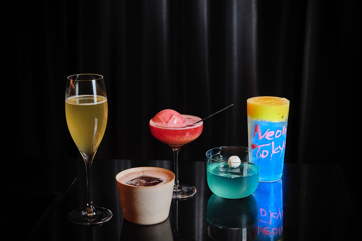 メニューから一例を紹介。「もしも、東京がサイバーパンクシティだったら?」という問いから生まれたのが、「ネオ(ン)東京スリング」というカクテル。シンガポール・スリングを現代の東京で再構築し、ライトを当てるとネオンさながらの青と黄色が浮かび上がる。トップには柚子のフォームを重ね、爽やかで香り豊かな味わいに仕上げている。