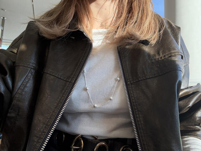 白Tにレザーブルゾンのラフなスタイルの日には、一連でさらっと。パールがぽつぽつと浮かび、シルバーの細いチェーンが煌めいて、一見すごくシンプルですが、つけると今っぽく、スタイリングを華やかにアップグレードしてくれます。