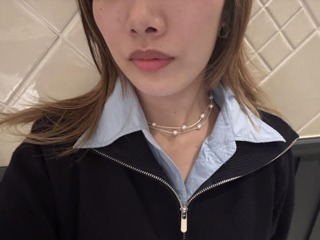 別の日は、シャツの襟元に二重でくるっと巻いてみました。重なることでパール感が増して想像以上に可愛い…! パールってクールにつけるのがかっこいいと思っていたんですけど、このネックレスは、気負わずにつけられて、こなれ感も演出できちゃいます。二重での付け方はとってもお気に入りです。
