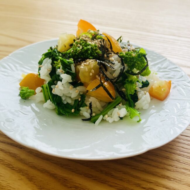 そんなオレンジ色の横に菜の花の鮮やかななグリーンが混じると余計に元気倍増。菜の花も同じくビタミンCが豊富。免疫力を向上させるβカロチンも多く含まれる優れもの。