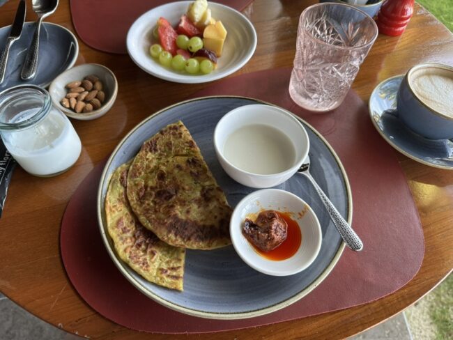 インドの朝食を食べてみました。Aloo Paratha(アルパラタ)というカレー風味がするジャガイモのパンケーキ。朝よりかは夕方のビールに合うかなと思いました。