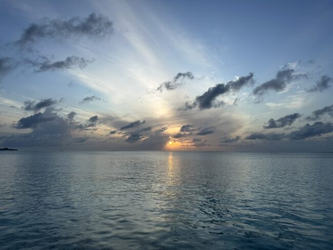 モルディブの1日は、飲んで食べて遊んでいると、あっという間に日がくれます。夕方の時間もモルディブリゾートの面白いところ。プライスレスなサンセットを目に焼き付けながら飲むカクテルは別格です。