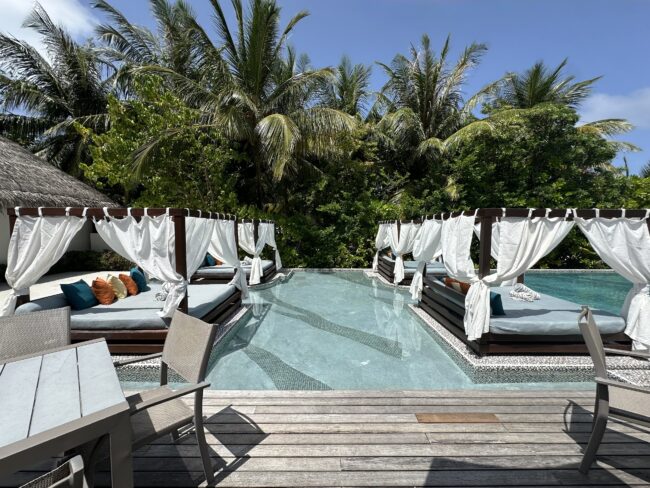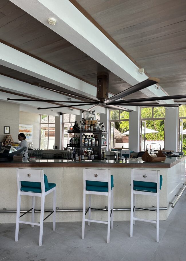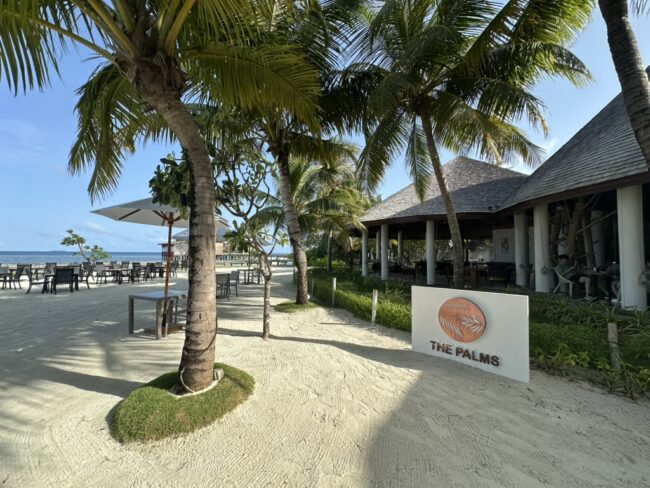 滞在中、私が足繁く通ったのがビーチフロントにあるプールバー&ピッツェリア。美しいラグーンを見渡せるプールサイドに位置していて、南マーレ環礁の息をのむようなサンセットを眺めながら、ドリンクとおつまみが楽しめます。