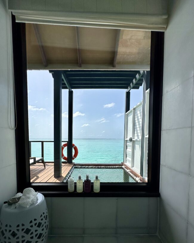 シャワールームからも海が眺められます。滝のように汗をかくし海にも入るし、1日に何度もシャワーを使うため、バスルームの快適さは気になる所。OZEN LIFE MAADHOO はそこも完璧。アメニティは英国の老舗ブランド「Asprey」という贅沢さ。