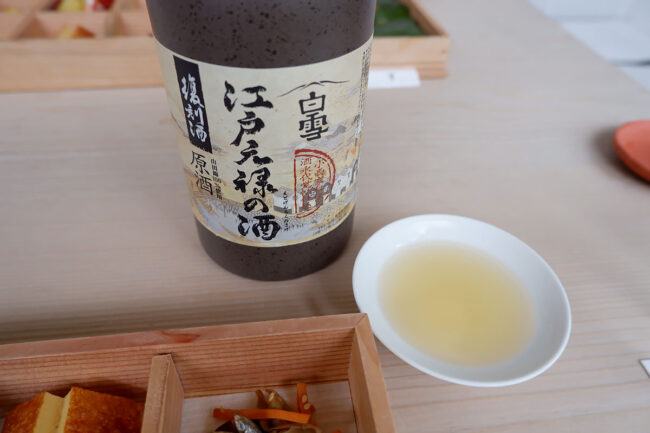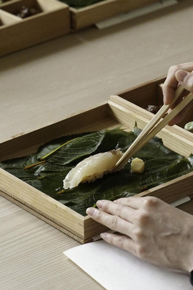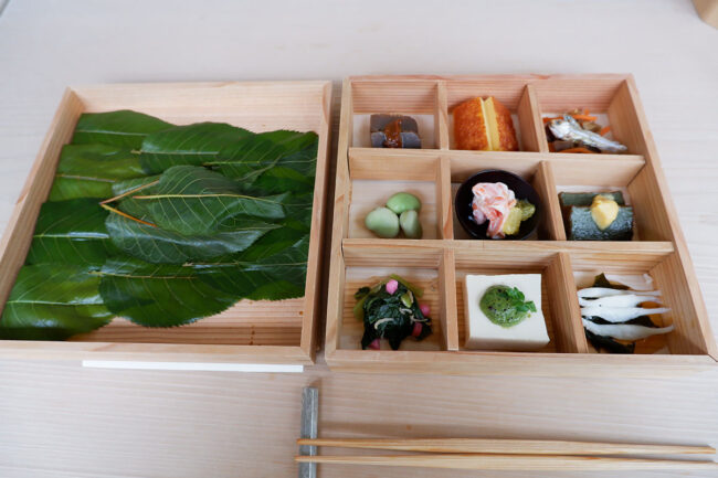 お話の後は、江戸のお花見をテーマにしたコース仕立ての料理をいただきました。二段重を開けると、一段目には桜の葉が敷き詰められ、中には鯛の香物酢が。江戸時代に生まれた山吹酢を使い、酸味がしっかりありながらも、桜の葉の香りを纏った上品な味わいでした。