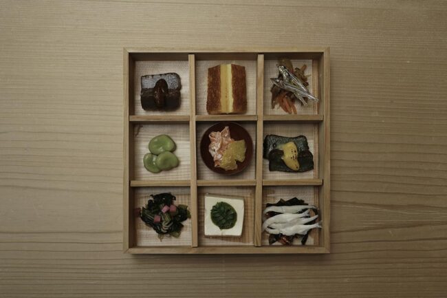 お重の二段目には、ごまめ金平やよもぎ麩田楽、甘夏と人参の白和えなど、江戸庶民が親しんだメニューの数々が詰められています。