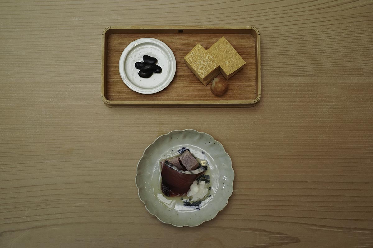 (右)霜降りかつお 叩き芋 玉子焼 座禅豆