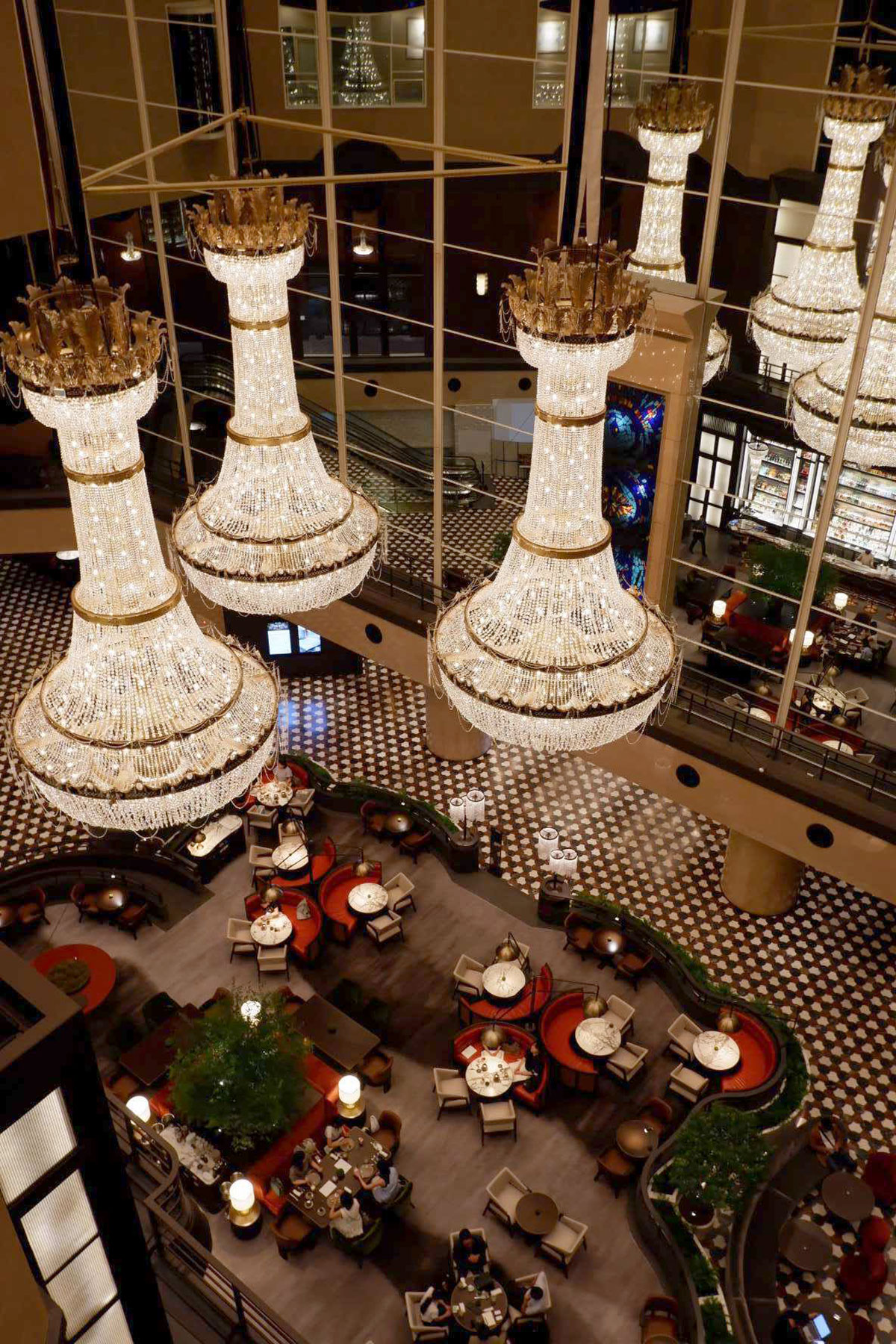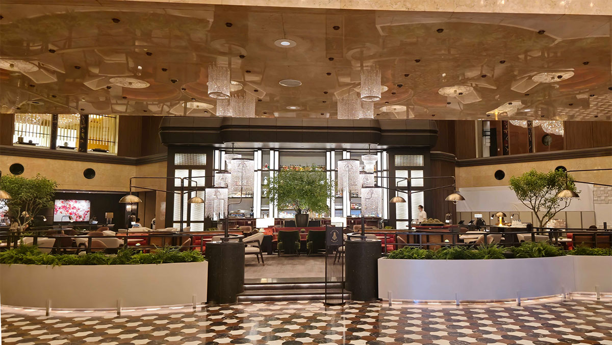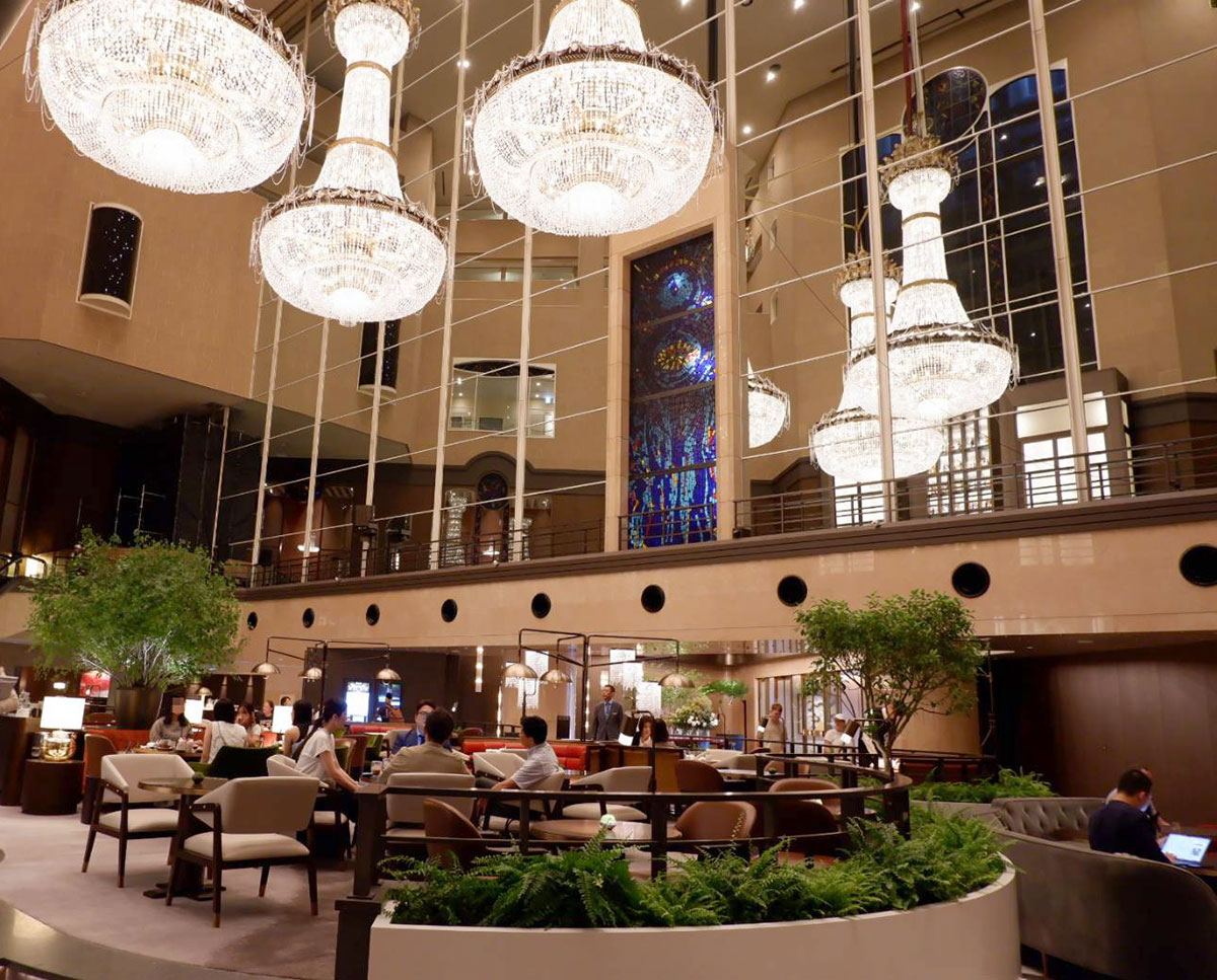 高さ28メートル、8階まで吹き抜けた空間に輝くのは、開業当初からホテルの象徴的な存在として飾られてきたシャンデリア。燦然と輝く眩い煌めきに吸い込まれそうになります。なんと、全部で約11万5千個ものスワロフスキー®・クリスタルが使われているというので驚きです。今回のリニューアルにあたり、このシャンデリアをすべて下ろしてLEDライトに置き換えたそう。ホテルの顔とも言えるシャンデリアの輝きが、古き良きクラシックなムードを残しながら、モダンな空間デザインとうまく融合しています。