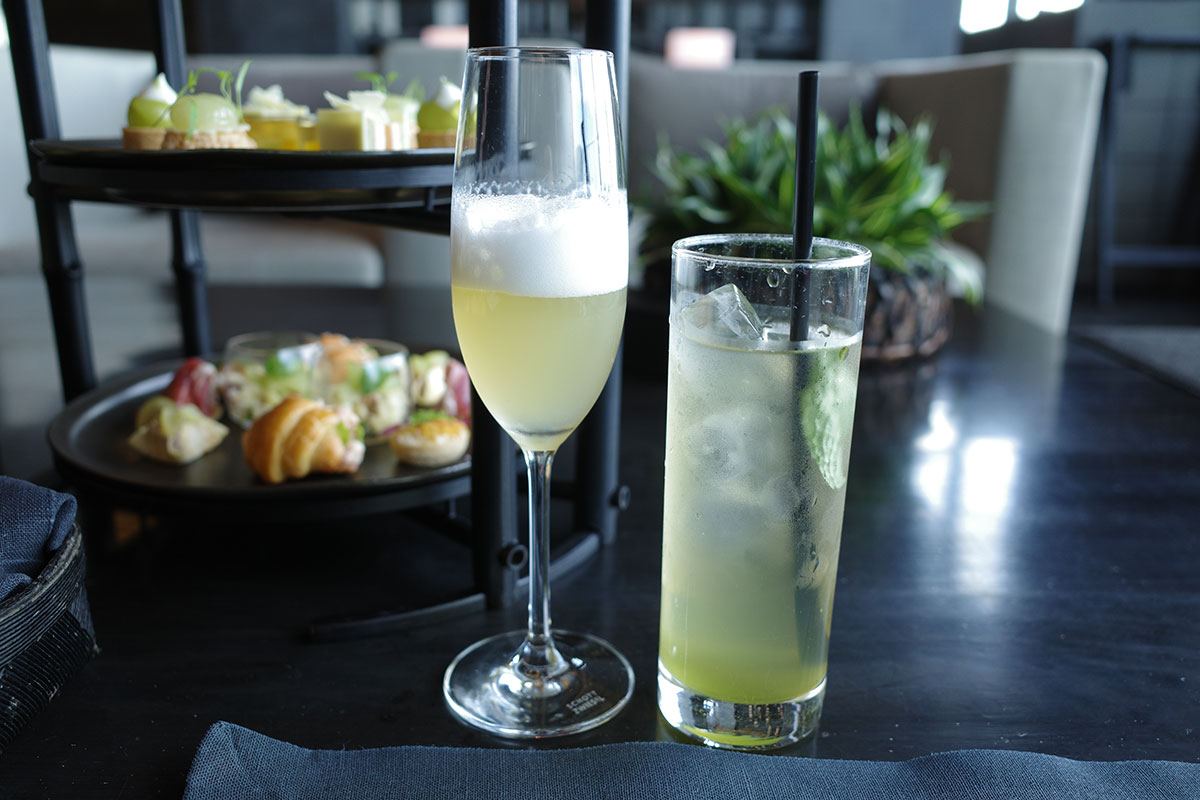 左のグラスは、モヒートのエスプーマをテーブルで注いで完成するマスカットのスープ。右は青りんごやホワイトグレープのシロップを使った爽やかなドリンクです。どちらも料理を邪魔しない、すっきりとした味わい。
