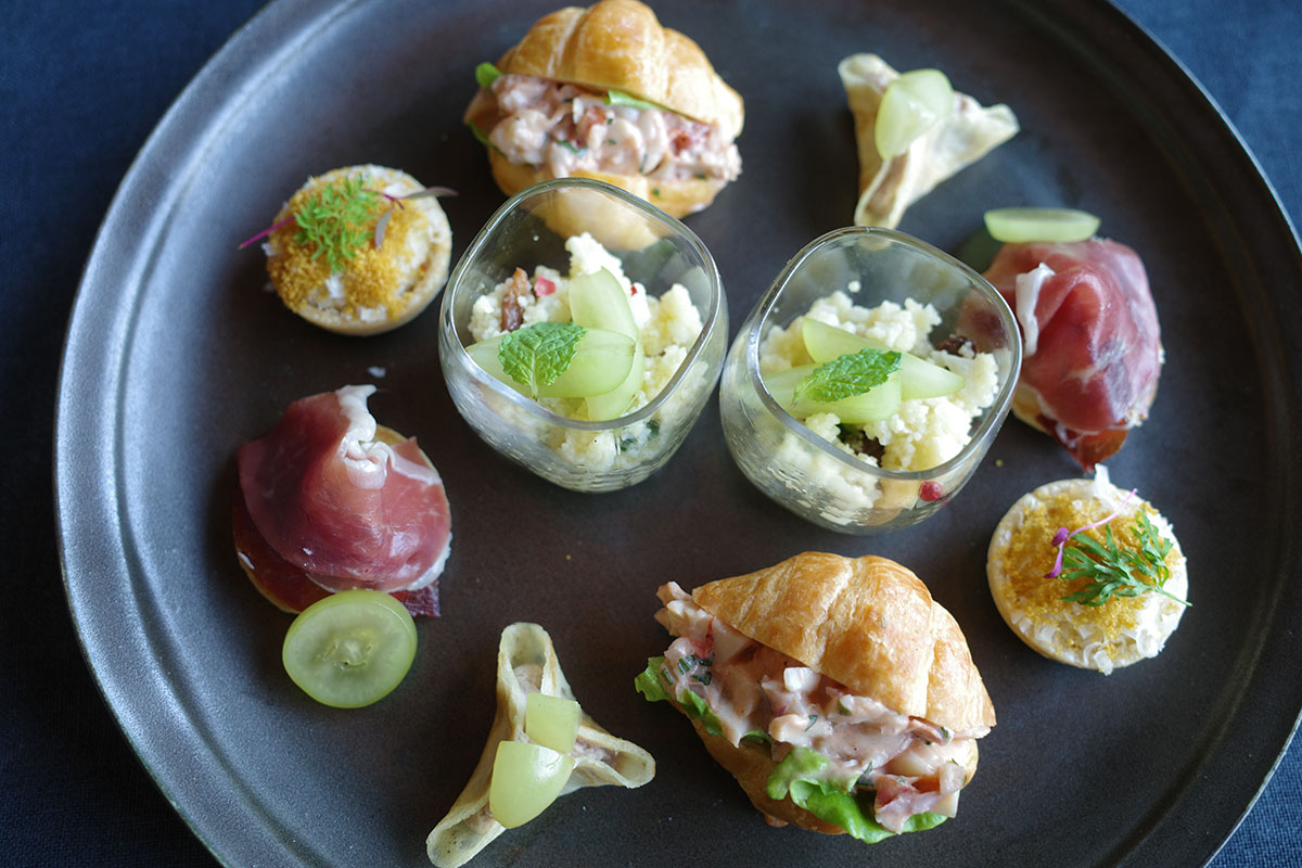 下段にはセイボリーがずらり。こちらはシャンパンが進みそうなメニューが勢揃い。シャインマスカットとイベリコハムのカナッペ セルベルドカニュ、シャインマスカットとクスクスサラダ レーズン ミント、かすみ鴨リエットのクレープ シャインマスカットなど、セイボリーでもシャインマスカットを心ゆくまで楽しめます。他にも、唐墨とパルメザンチーズのキッシュ、ミニブリオッシュロール オマールサラダなど、贅沢食材を使ったメニューも絶品です。